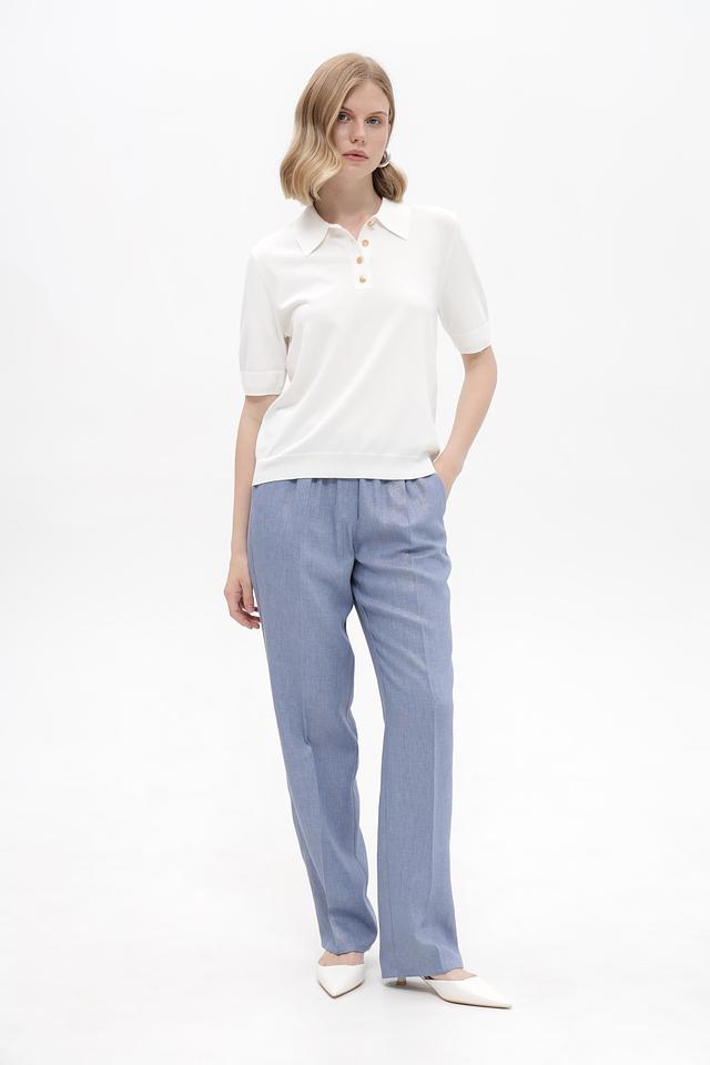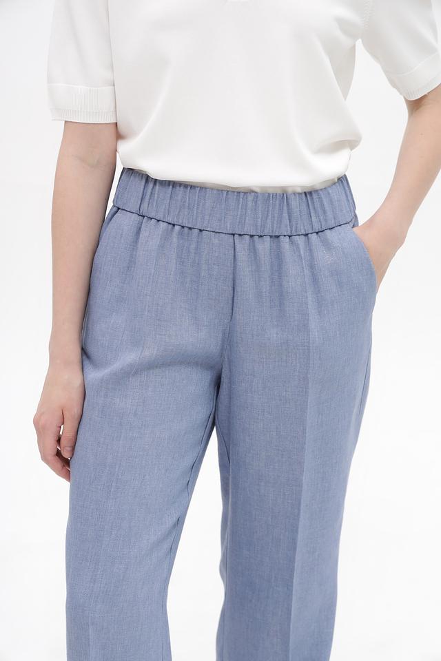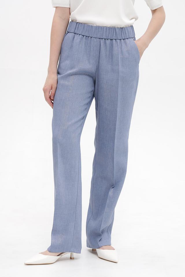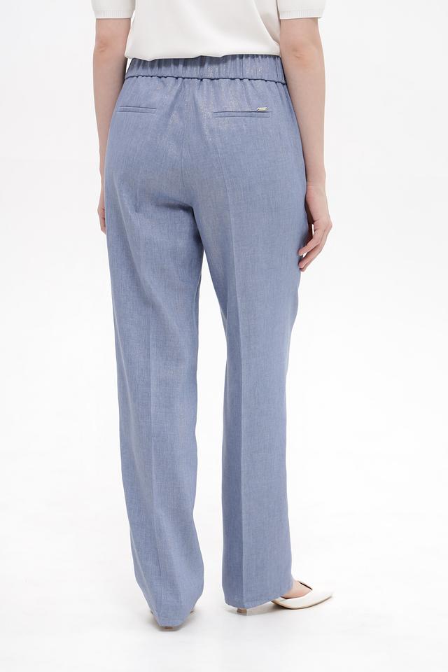 Брюки имеют прямой крой и эластичный пояс, благодаря чему идеально сидят по фигуре и не сковывают движений. Голубой цвет придаёт образу свежесть и лёгкость.