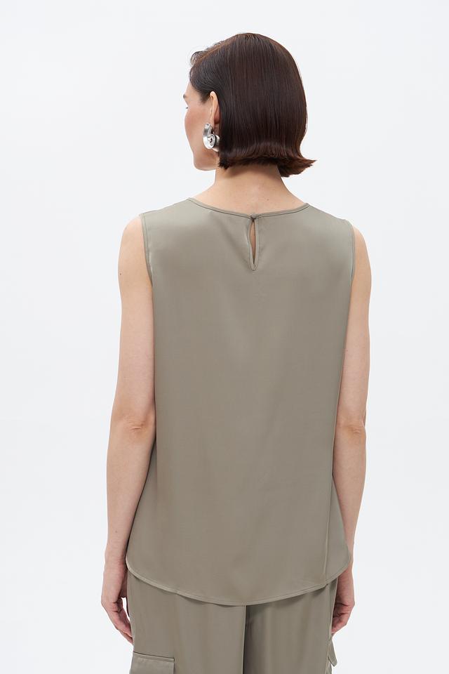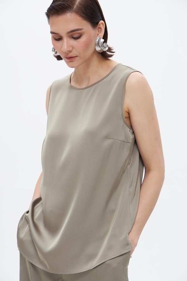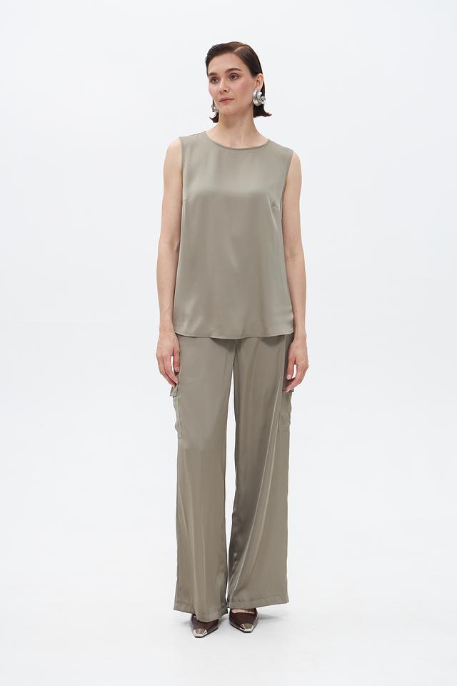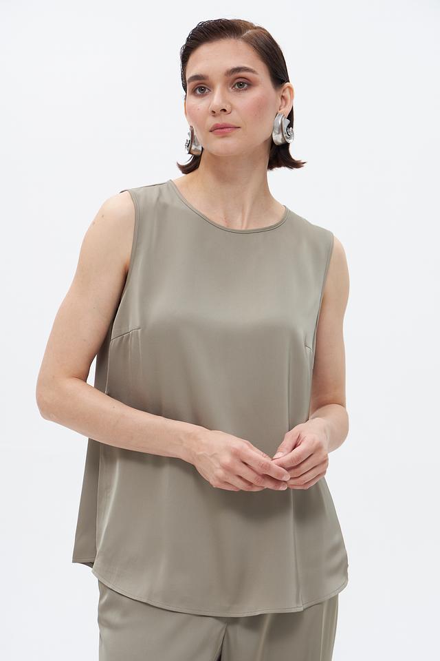 Топ имеет прямой крой, круглый вырез горловины и широкие бретели, что обеспечивает удобную посадку по фигуре. Изготовлен из 100% полиэстера, что делает его приятным на ощупь, легким и простым в уходе.