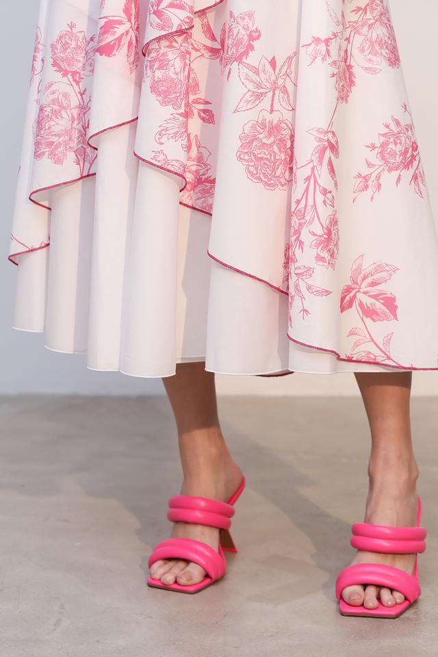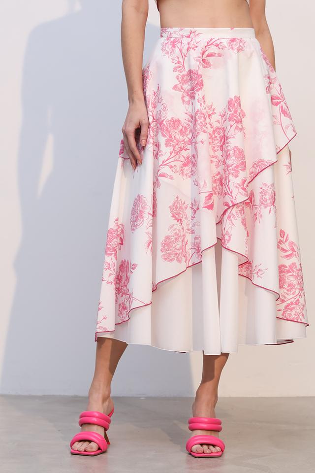 Юбка имеет нежно-розовый цвет и украшена ярким цветочным принтом, который придает ей особую изысканность. Асимметричный крой и многослойный дизайн создают эффект легкости и динамики.