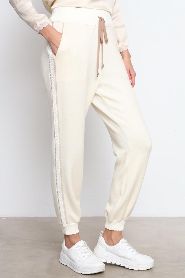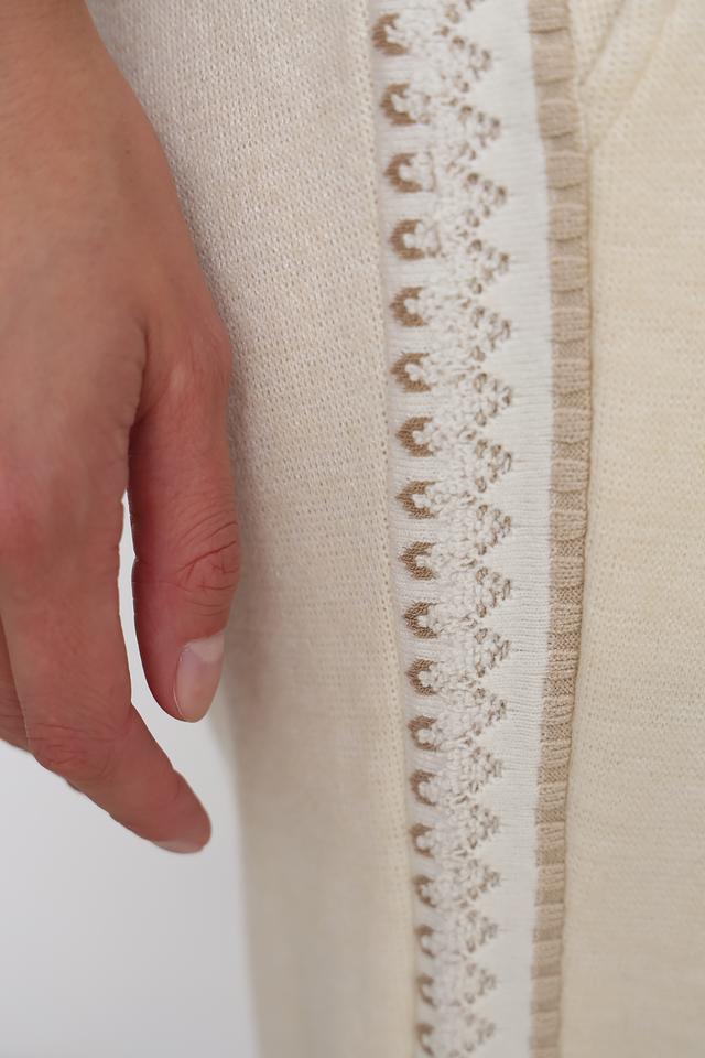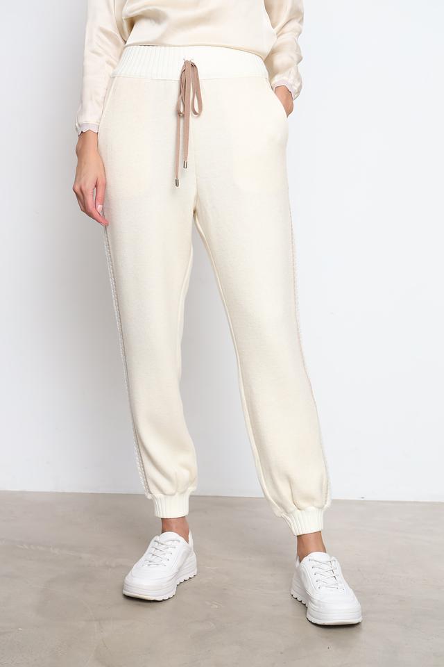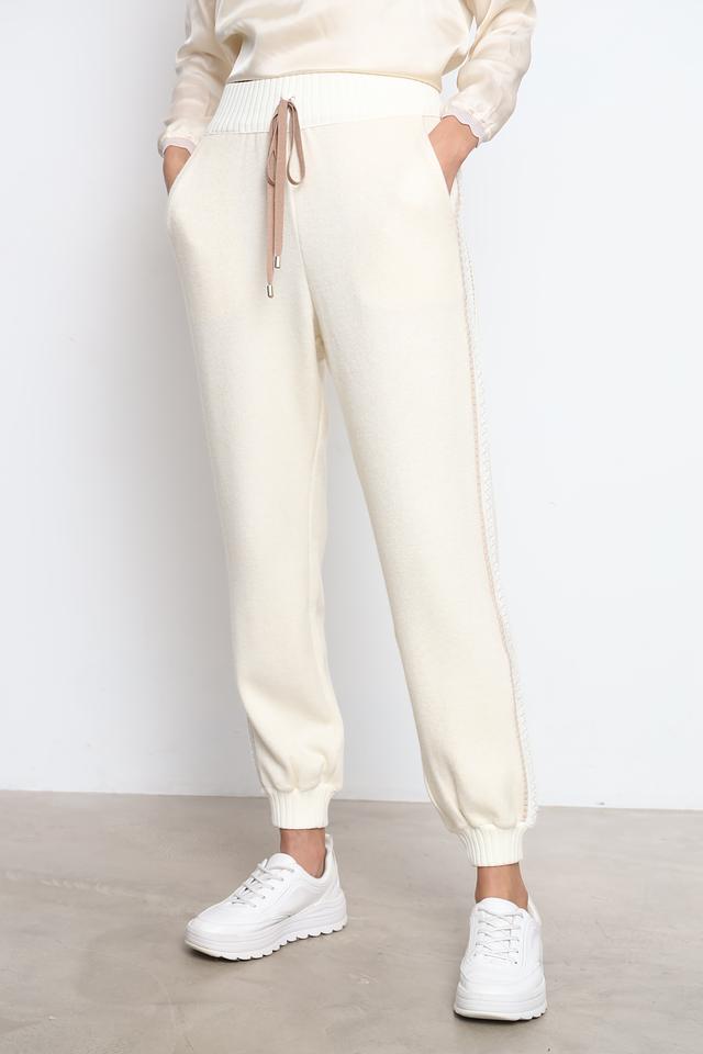 Модель имеет классический крой с завышенной талией и прямыми штанинами. Удобный пояс на резинке обеспечивает идеальную посадку по фигуре. Боковые карманы добавляют функциональности. Декоративная полоса с плетением вдоль штанины придает брюкам особый шарм и изысканность.