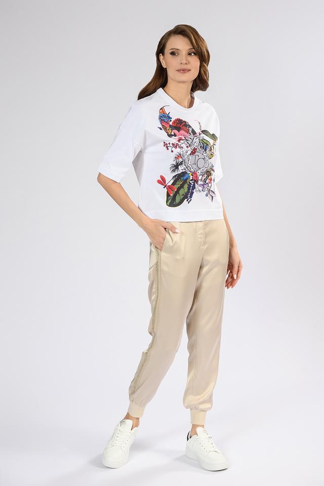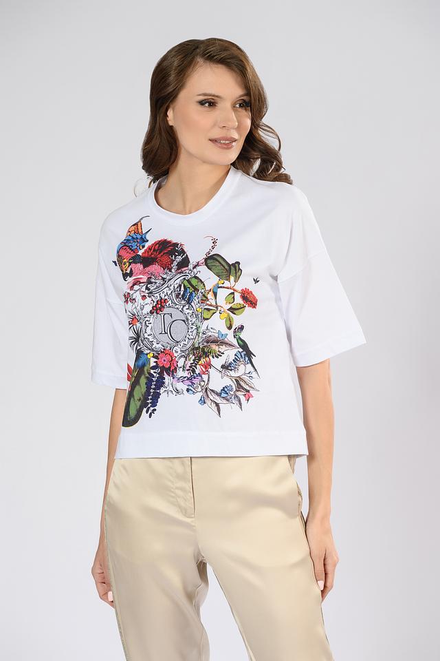 Белая футболка Tricot Chic с ярким цветочным принтом и изображением птиц. Изготовлена из 100% хлопка, обеспечивая комфорт и воздухопроницаемость. Стильный и оригинальный дизайн для создания неповторимого образа. Состав: хлопок 100%