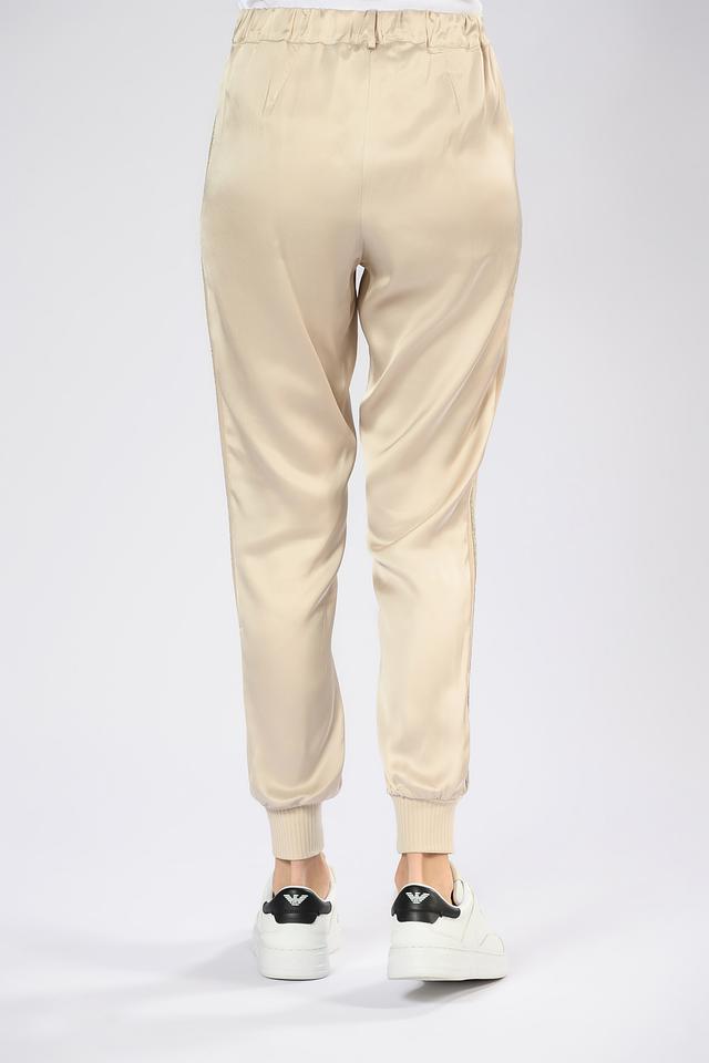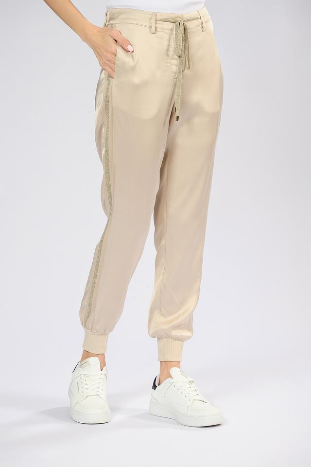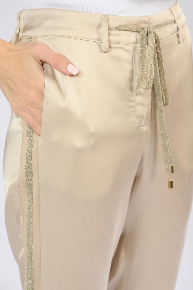 Модель имеет эластичный пояс с кулиской, что позволяет регулировать посадку. По бокам брюк проходит декоративная полоска с золотистым блеском, добавляющая образу элегантности. Брюки заужены к низу, что придает им современный вид.