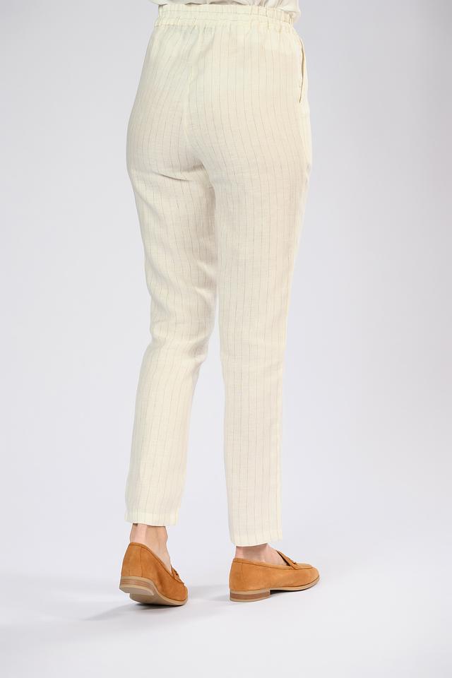 Состав ткани: 50% лен, 47% хлопок, 3% вискоза. Лен придает брюкам лёгкость и воздухопроницаемость, хлопок — мягкость и комфорт, а вискоза — приятную текстуру и небольшой блеск.