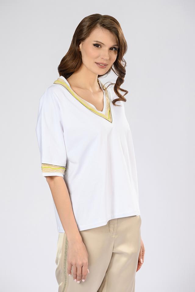Особенностью модели является V-образный вырез, который подчеркивает женственность и изящество. Декоративная отделка люрексом придает блузе праздничный и нарядный вид. Короткие рукава делают ее идеальным выбором для теплой погоды.