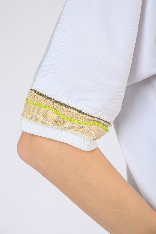 Белая блуза Tricot Chic с V-образным вырезом и декоративной отделкой люрексом. Модель выполнена из мягкого хлопка с добавлением вискозы и нейлона, что обеспечивает комфорт и приятные тактильные ощущения. Стильный и универсальный вариант для создания повседневных образов. Состав: хлопок 91%, вискоза 7%, нейлон 1%, люрекс 1%