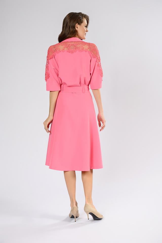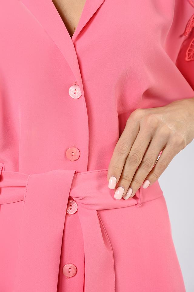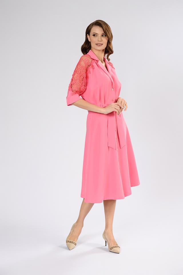 Модель отличается оригинальным дизайном: воротник рубашечного типа, застёжка на пуговицы по всей длине и пояс, акцентирующий талию. Рукава 3/4 выполнены из изящного кружева, добавляющего образу романтичности.
