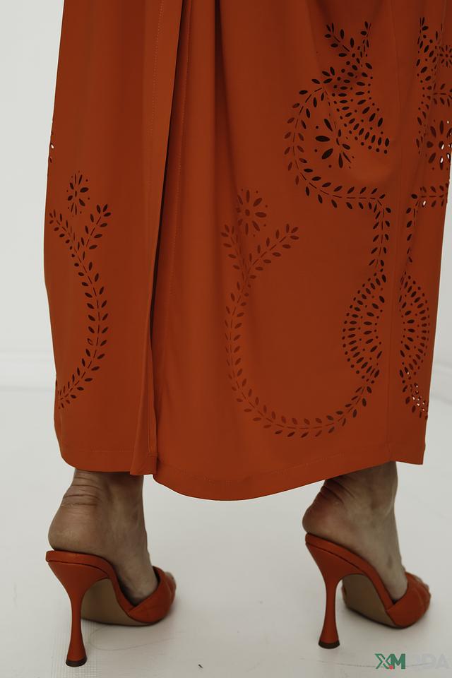 Платье имеет приталенный силуэт, подчеркивающий фигуру, и длину миди. Яркий алый цвет делает его заметным и привлекательным. Особый акцент – это декоративные вырезы в области лифа и юбки, добавляющие платью изысканности и оригинальности.