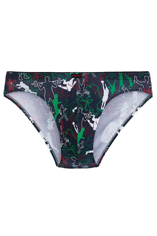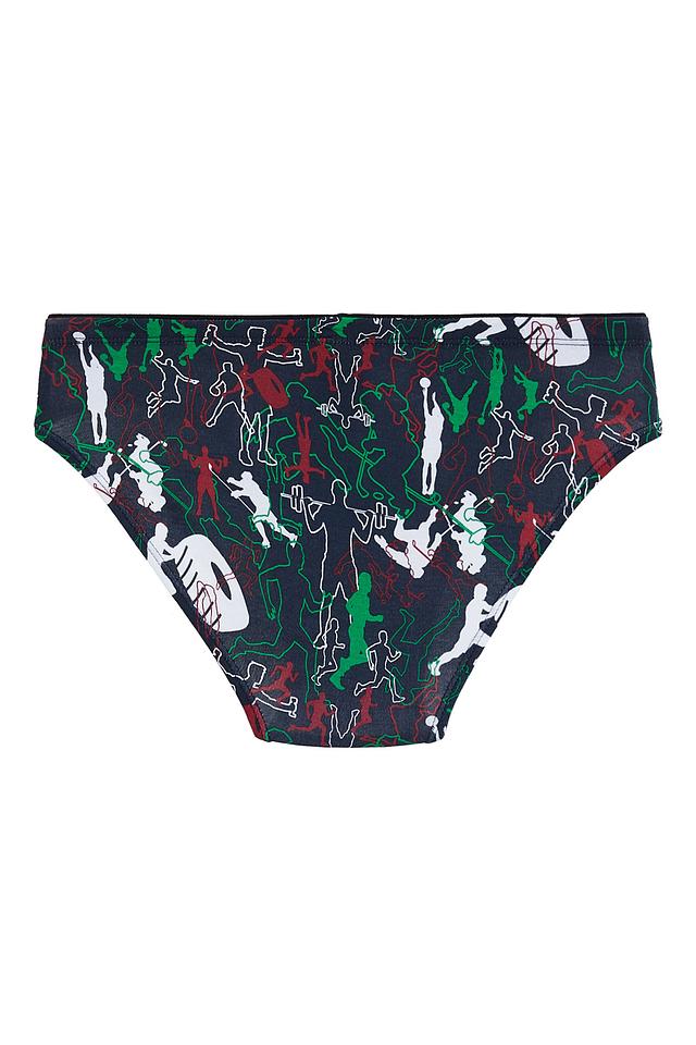Трусы имеют классический крой и эластичный пояс с логотипом бренда. Отличительной особенностью является оригинальный принт с изображением спортивных фигур в различных цветах: белом, красном и зеленом на тёмно-синем фоне.