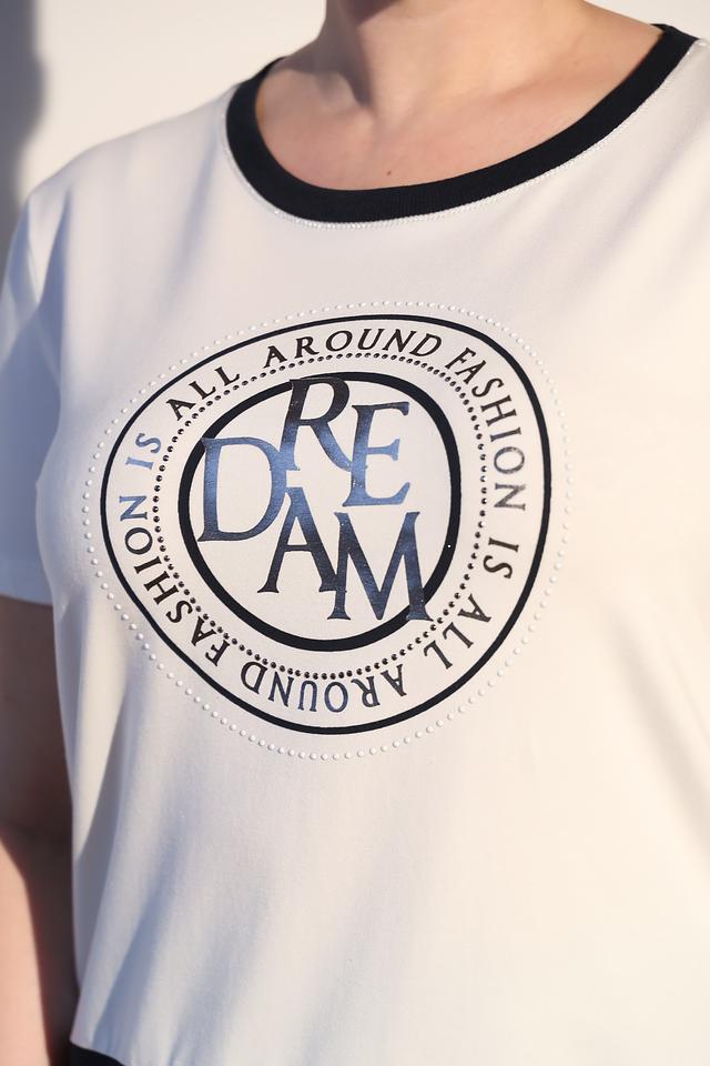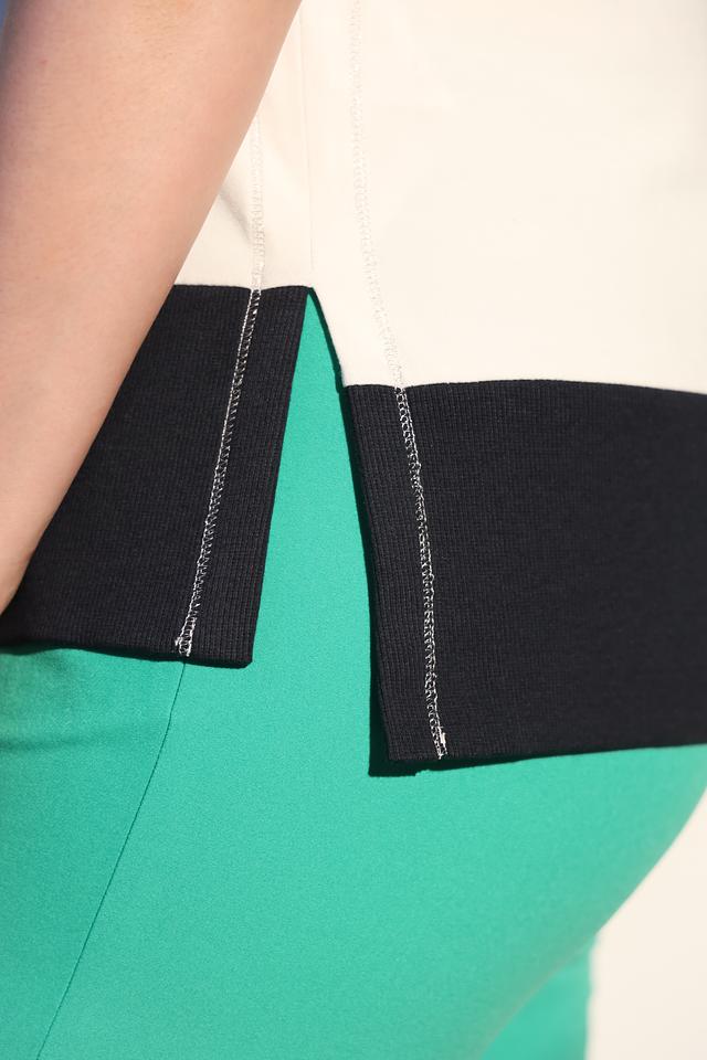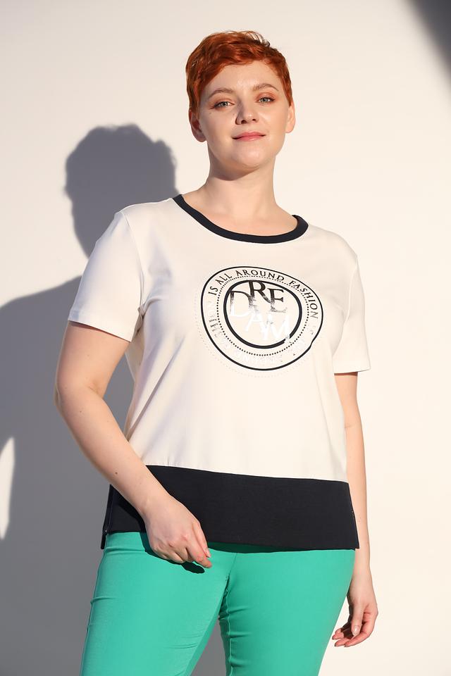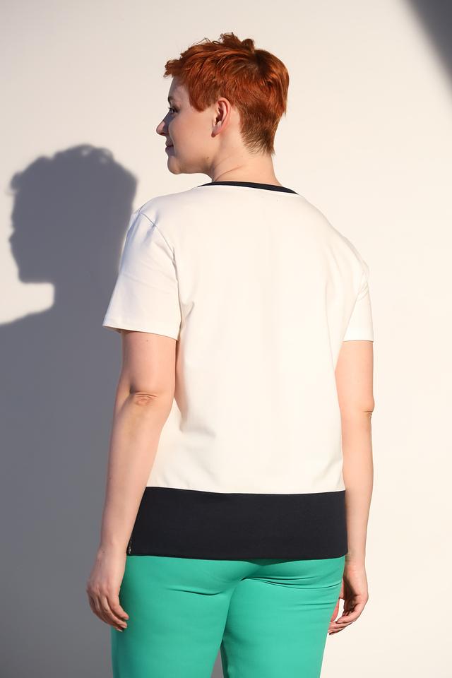 Модель имеет классический крой с короткими рукавами и круглым вырезом горловины, отделанным чёрной тесьмой. Нижняя часть футболки выполнена из чёрной ткани, создавая контрастный и современный образ.