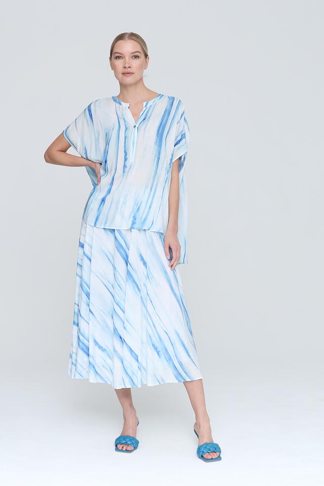 Юбка имеет длину миди и свободный крой, который не сковывает движения. Оригинальный принт в виде волн придает ей неповторимый стиль и делает ее отличным выбором для создания ярких образов.