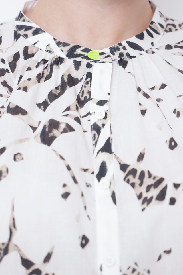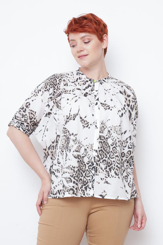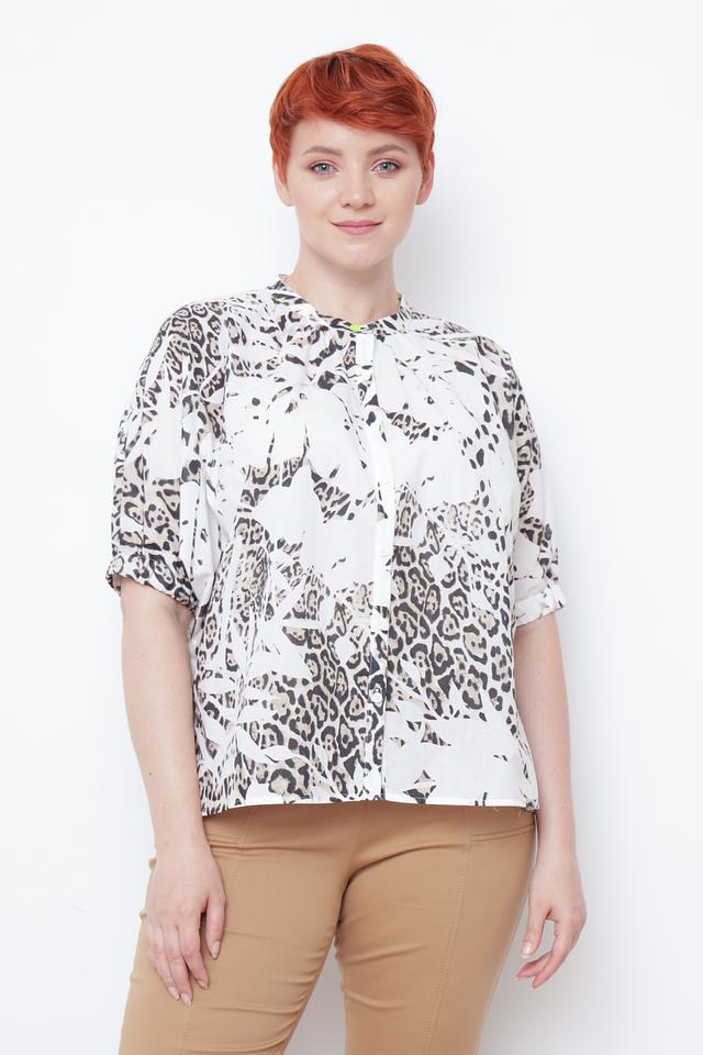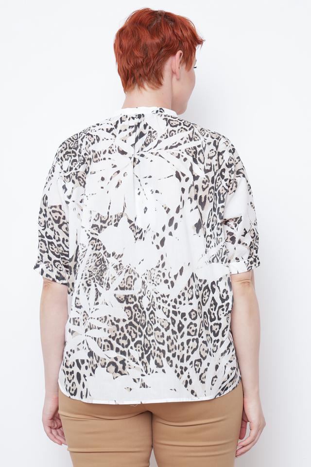 Блуза имеет свободный крой, короткие рукава и воротник с небольшим вырезом и завязками. Привлекает внимание оригинальный принт, имитирующий леопардовую расцветку в белых и серых тонах. Застежка выполнена на пуговицы.