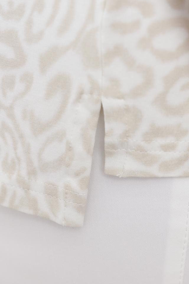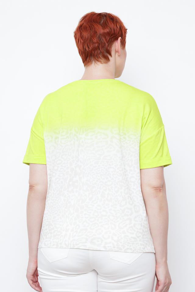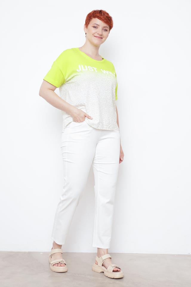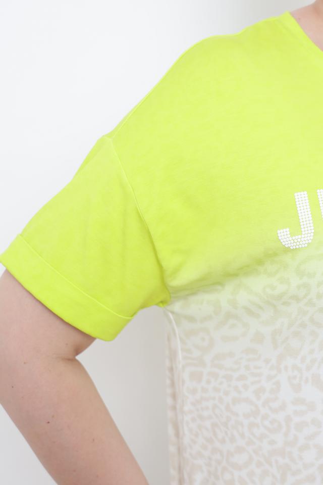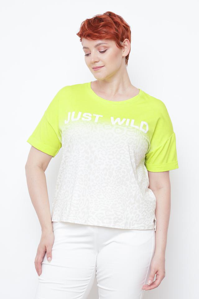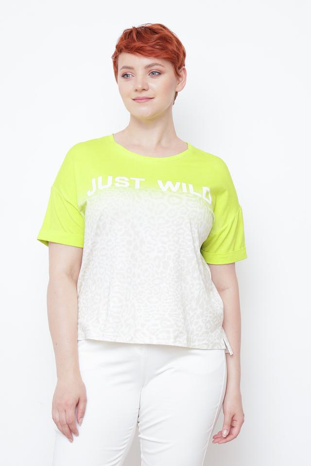 Верхняя часть футболки выполнена в ярком лаймовом цвете, а нижняя – с оригинальным принтом, имитирующим леопардовую расцветку. Надпись "JUST WILD" на груди добавляет образу дерзости и индивидуальности.