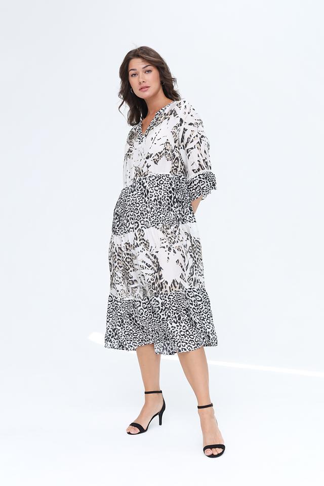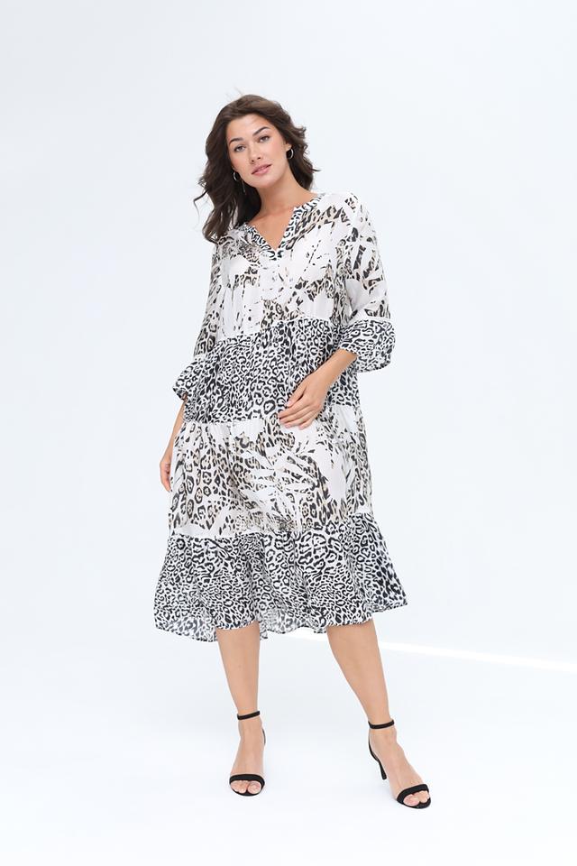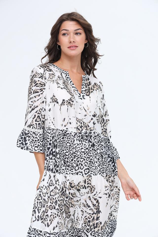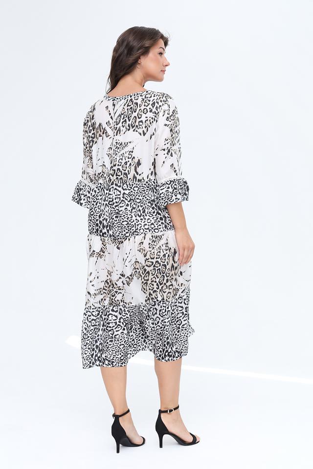 Платье Tuzzi бежевого цвета с ярким леопардовым принтом – стильное и комфортное решение для создания женственного образа. Модель выполнена из лёгкой ткани с рукавами 3/4 и многослойной юбкой. Состав: купро 53%, вискоза 47%