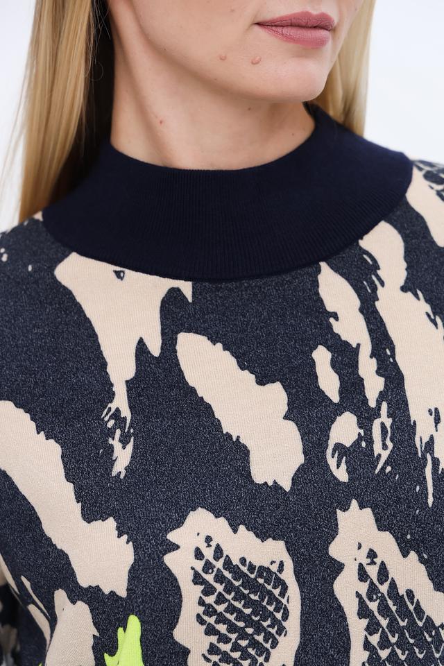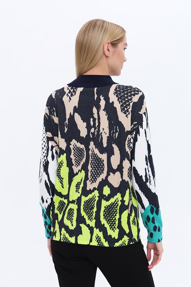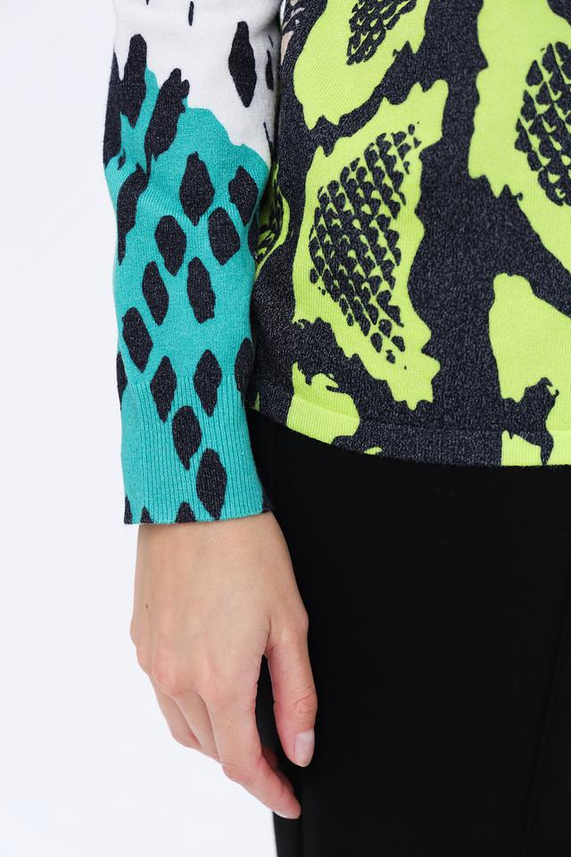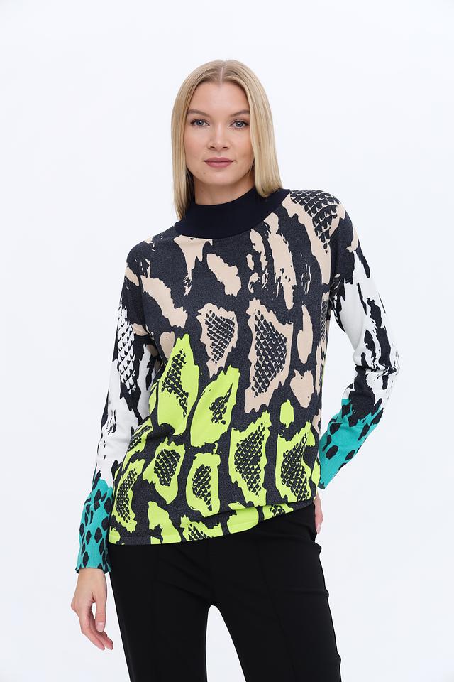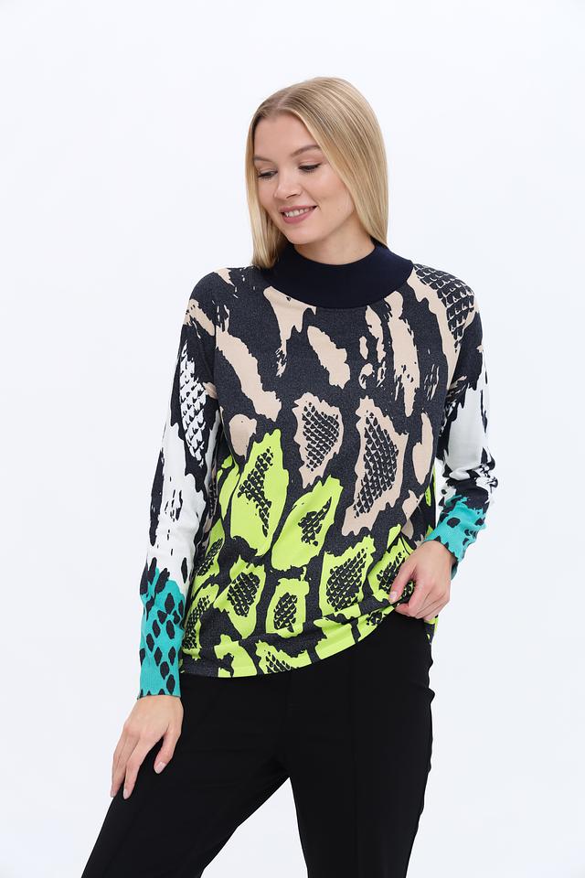 Пуловер имеет высокий воротник-стойку и длинные рукава. Основной цвет изделия – чёрный, но его украшает эффектный принт, имитирующий кожу рептилии, выполненный в сочетании бежевых, зелёных и бирюзовых оттенков.