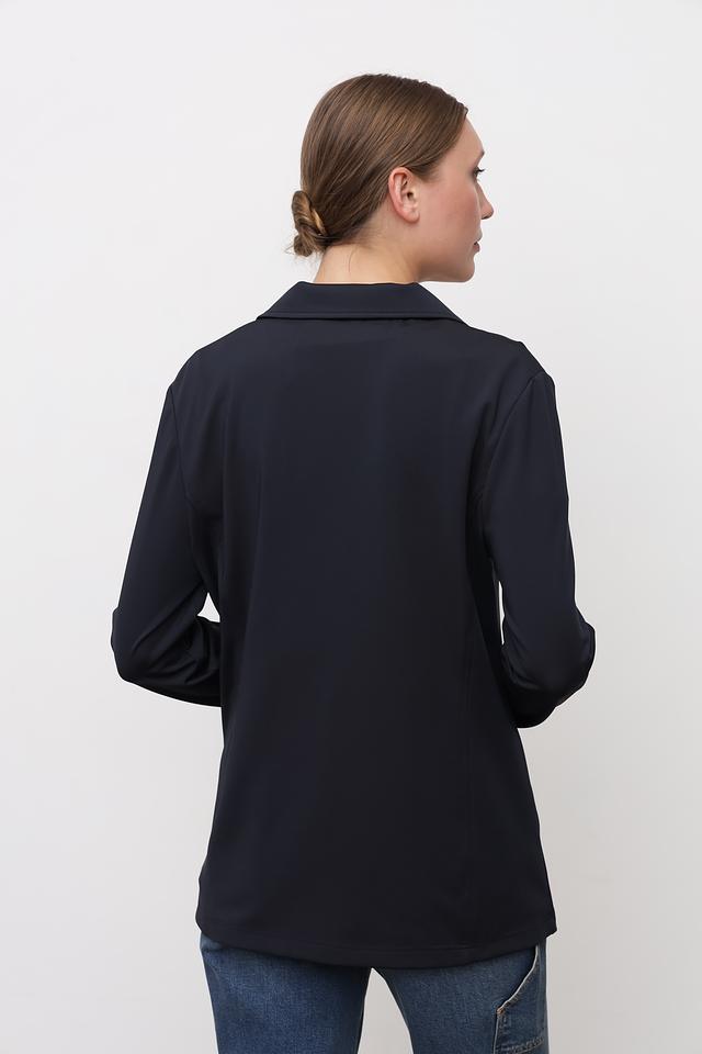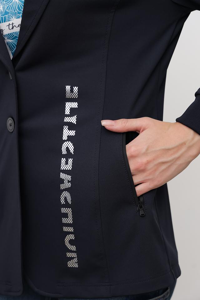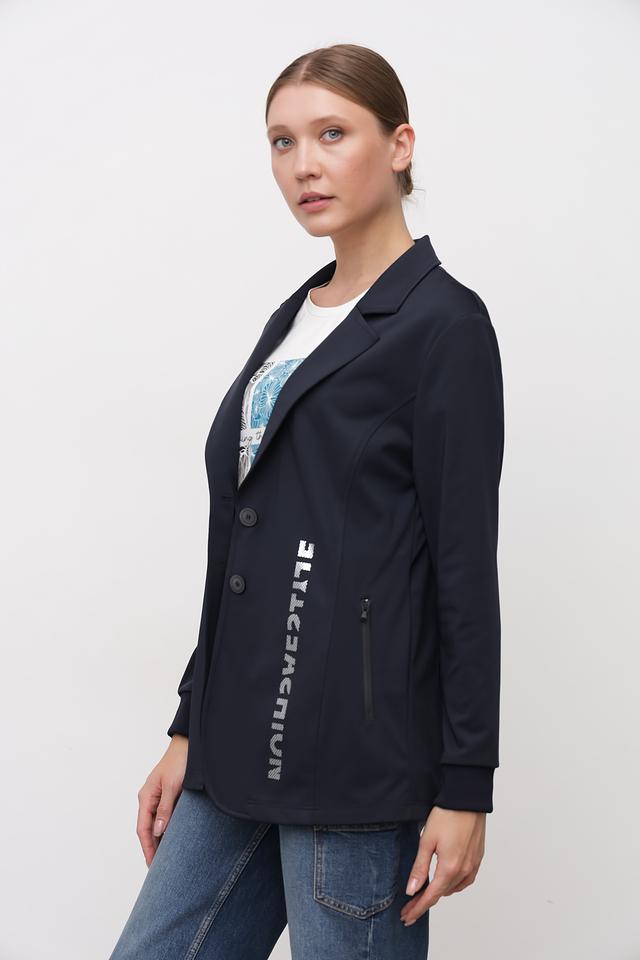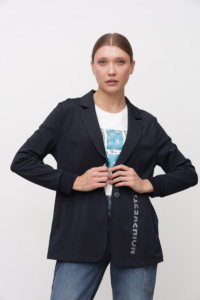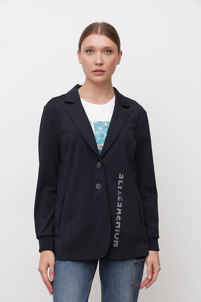 Жакет Tuzzi темно-синего цвета – стильная и современная модель с оригинальной надписью на рукаве. Прямой крой и лаконичный дизайн делают его универсальным дополнением к любому образу. Состав: полиэстер 94%, эластан 6%