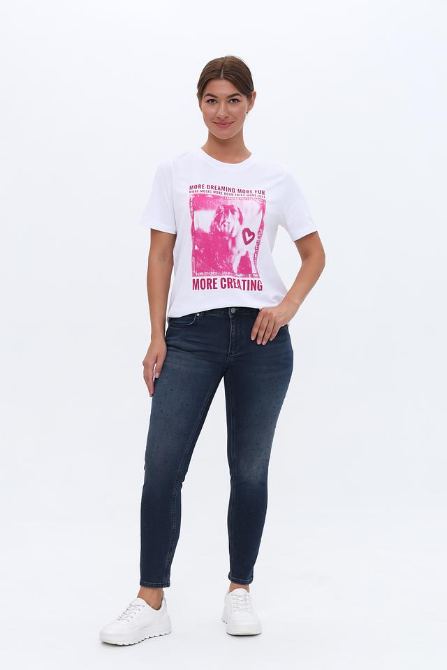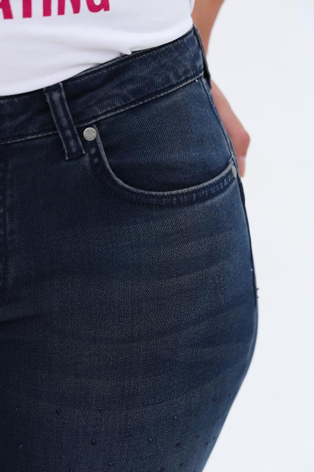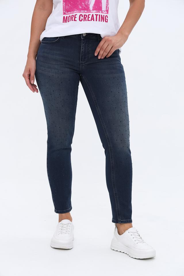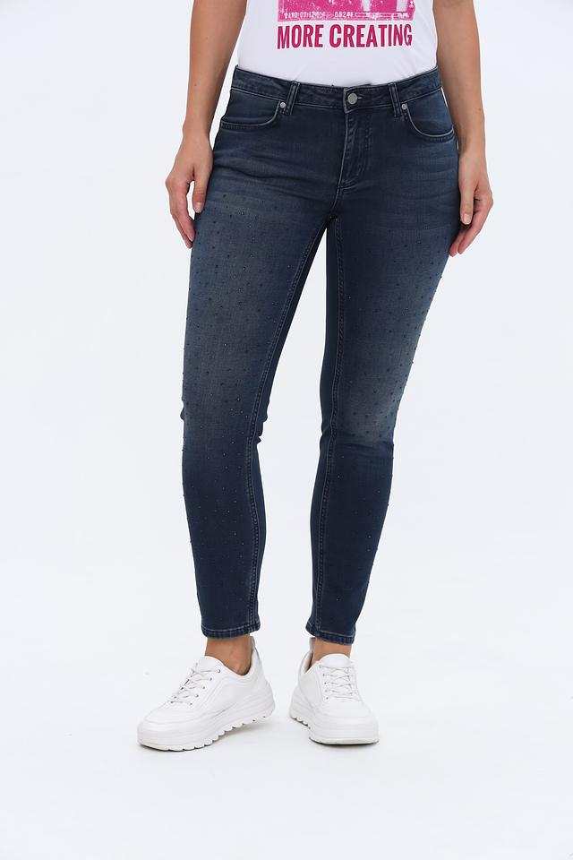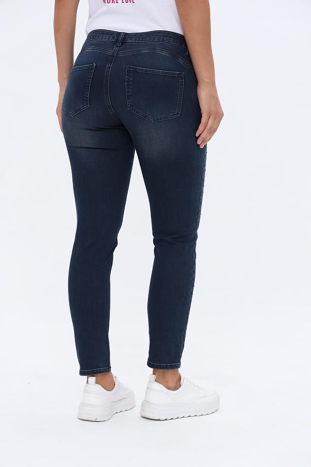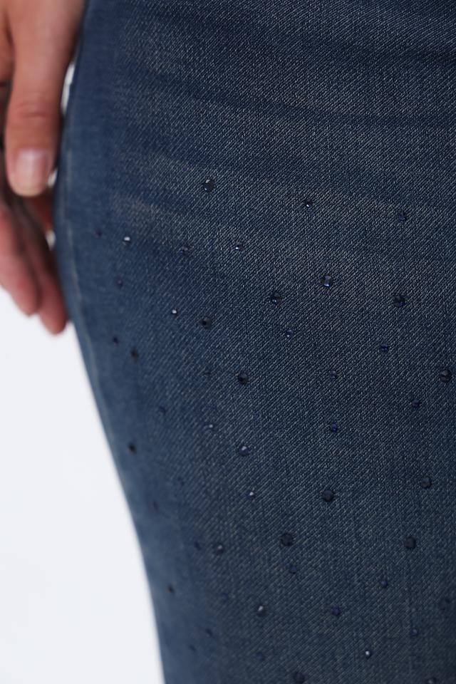 Джинсы имеют зауженный крой, который подчеркивает фигуру и обеспечивает комфортную посадку. Декоративные элементы в виде страз придают джинсам особый шарм и делают их более интересными.