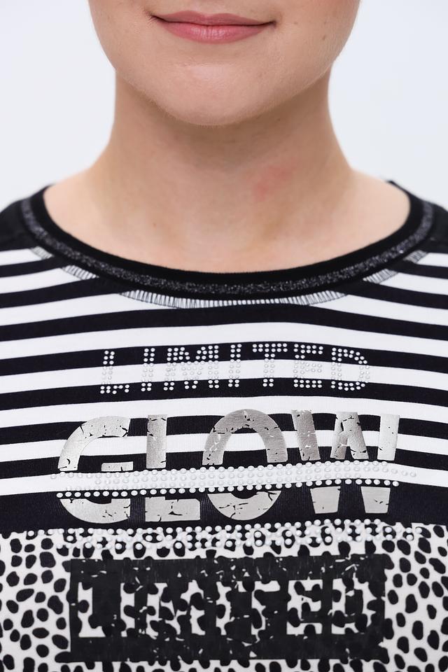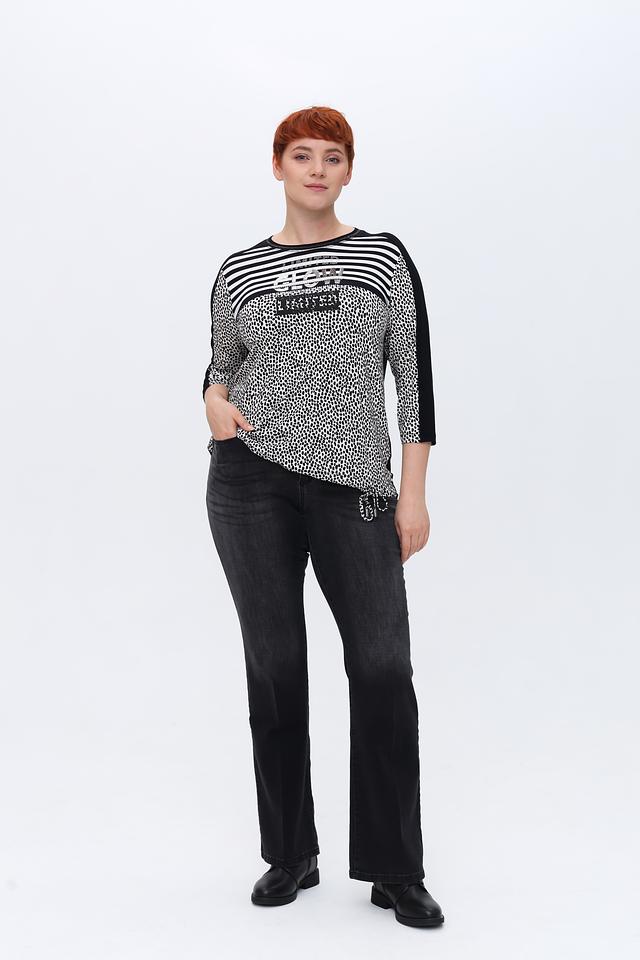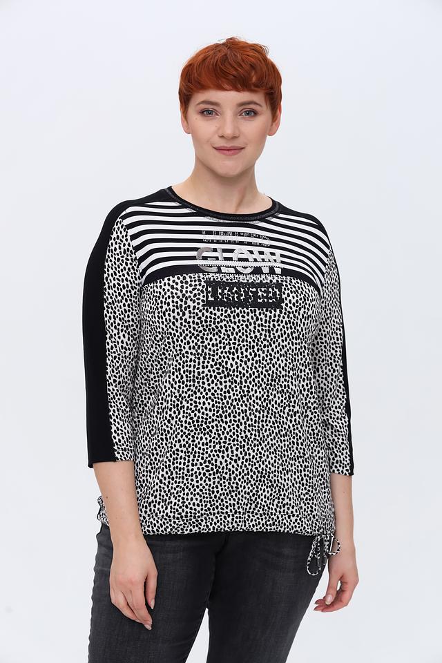 Женский лонгслив Tuzzi чёрно-белого цвета с оригинальным сочетанием полоски и леопардового принта. Модель с рукавом 3/4 и округлым вырезом горловины, выполнена из мягкой и приятной к телу вискозы с добавлением эластана. Состав: вискоза 95%, эластан 5%