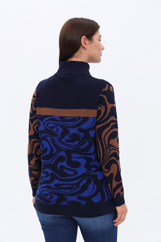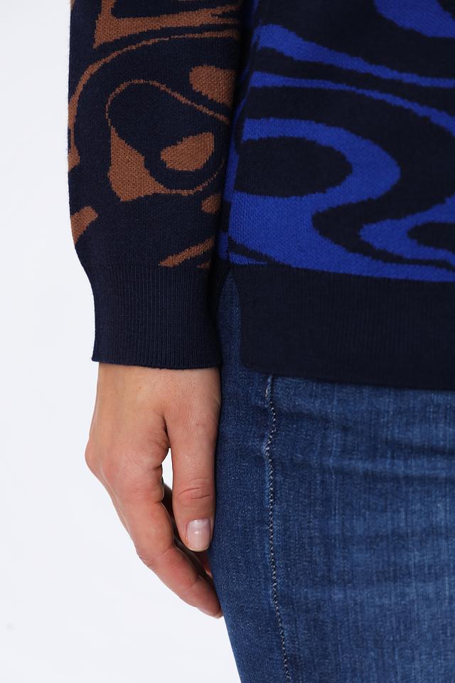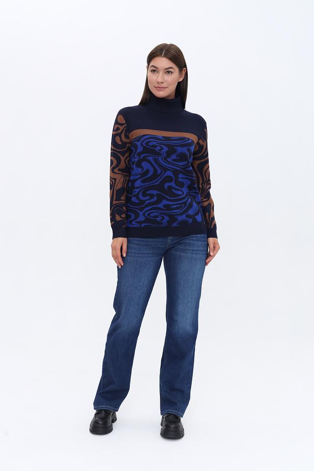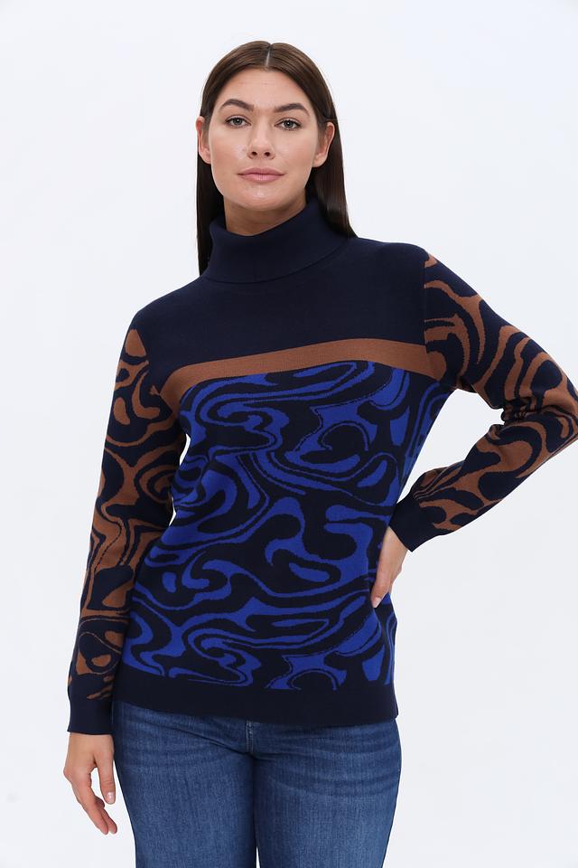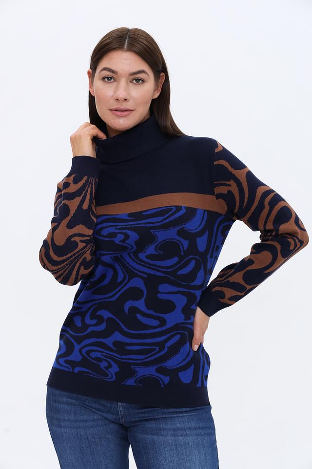 Этот стильный пуловер от Tuzzi выполнен в насыщенном синем цвете и украшен необычным узором, сочетающим в себе коричневые и синие элементы. Высокий воротник добавляет элегантности и защищает от холода.