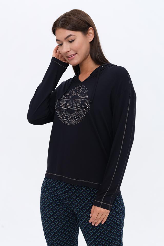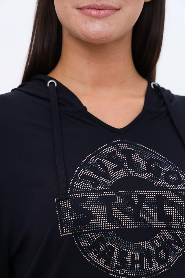 Модель имеет удобный капюшон и длинные рукава, а также украшена эффектным декором из страз, который придает ей особую изысканность. Пуловер выполнен из высококачественной вискозы с добавлением эластана, что обеспечивает мягкость, приятные тактильные ощущения и хорошую посадку по фигуре.
