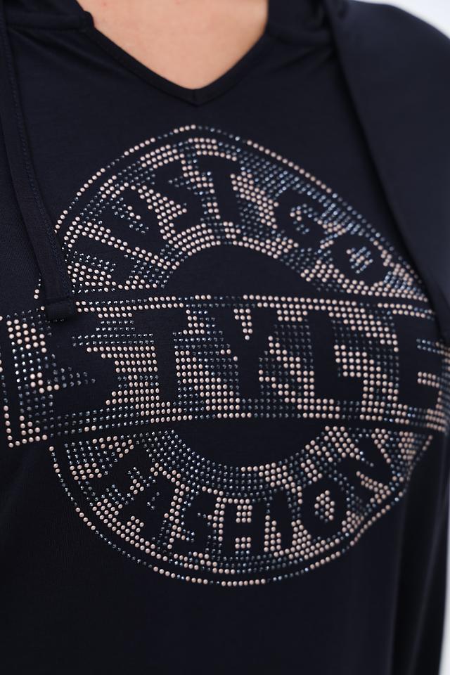 Стильный пуловер Tuzzi тёмно-синего цвета с эффектным декором из страз. Модель с капюшоном и длинными рукавами станет отличным дополнением к вашему образу. Изготовлен из мягкой и приятной к телу вискозы с добавлением эластана. Состав: вискоза 95%, эластан 5%