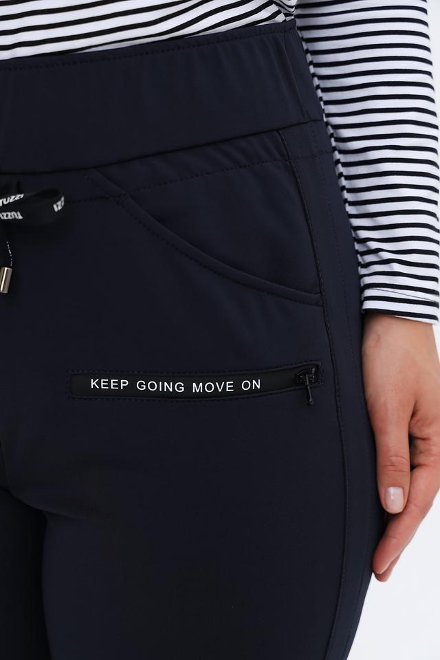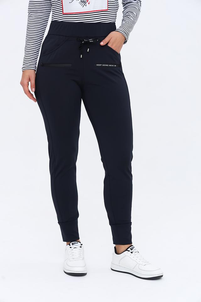 Особенности модели: эластичный пояс с регулируемым шнурком, боковые карманы, манжеты внизу брюк. На левой штанине имеется декоративная вставка с надписью "KEEP GOING MOVE ON".