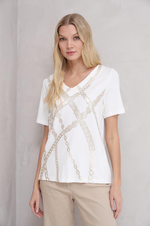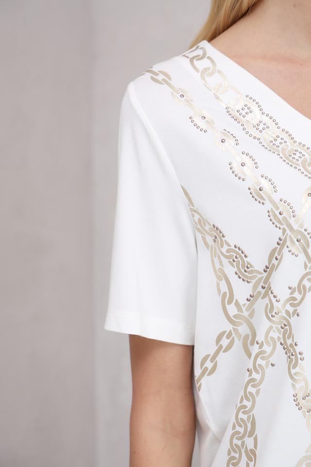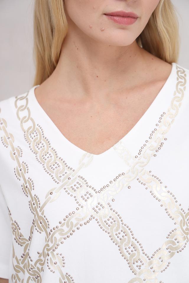 Белая футболка Tuzzi с V-образным вырезом украшена золотистыми цепочками. Модель из мягкой вискозы с добавлением эластана обеспечит комфорт и свободу движений. Состав: вискоза 95%, эластан 5%