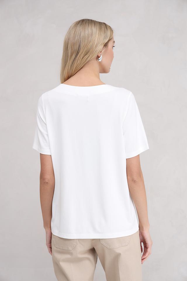 Футболка имеет удобный V-образный вырез и короткие рукава. Крой слегка свободный, что обеспечивает комфортную посадку по фигуре. Изготовлена из высококачественной вискозы с добавлением эластана, благодаря чему она приятна к телу, хорошо драпируется и не мнется.
