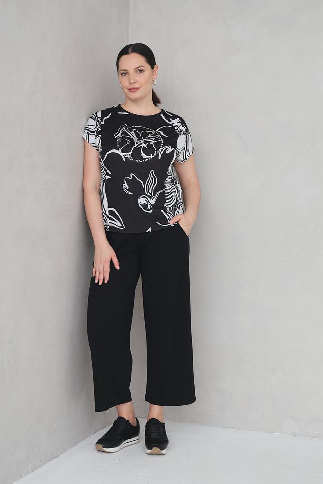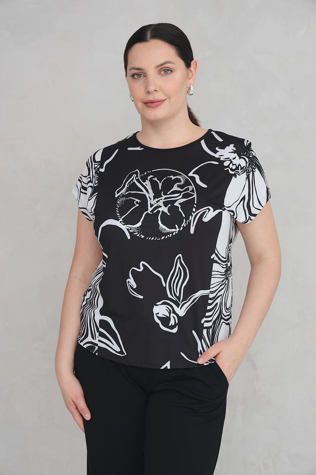 Эта блуза от Tuzzi – идеальный выбор для создания элегантного и женственного образа. Блуза выполнена в чёрном цвете и украшена ярким белым цветочным принтом, который придает ей особую изысканность.