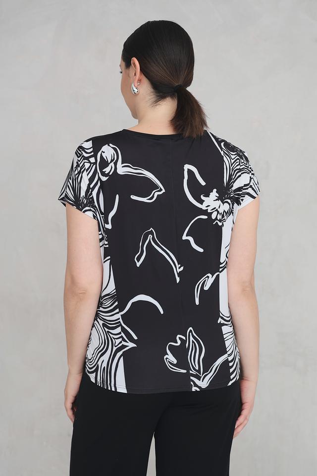 Блуза Tuzzi чёрного цвета с оригинальным белым цветочным принтом станет стильным дополнением вашего гардероба. Модель выполнена из лёгкой и приятной к телу ткани, обеспечивающей комфорт в течение дня. Состав: полиэстер 85%, эластан 15%