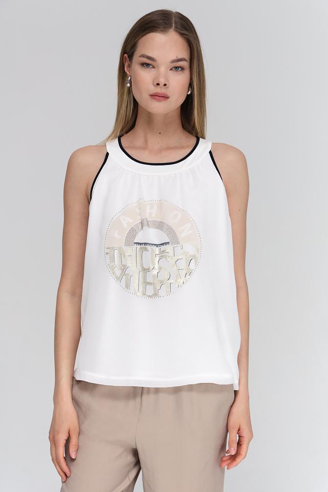 Топ имеет свободный крой и широкие бретели, что делает его идеальным для жаркой погоды. Особый акцент в дизайне — это оригинальный принт в бежево-золотистых тонах, выполненный в форме круга с надписью “FASHION”. Чёрная окантовка по горловине и пройме придаёт топу завершенный вид.