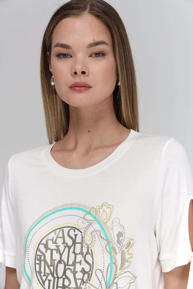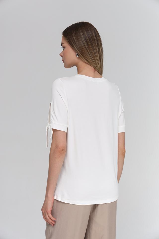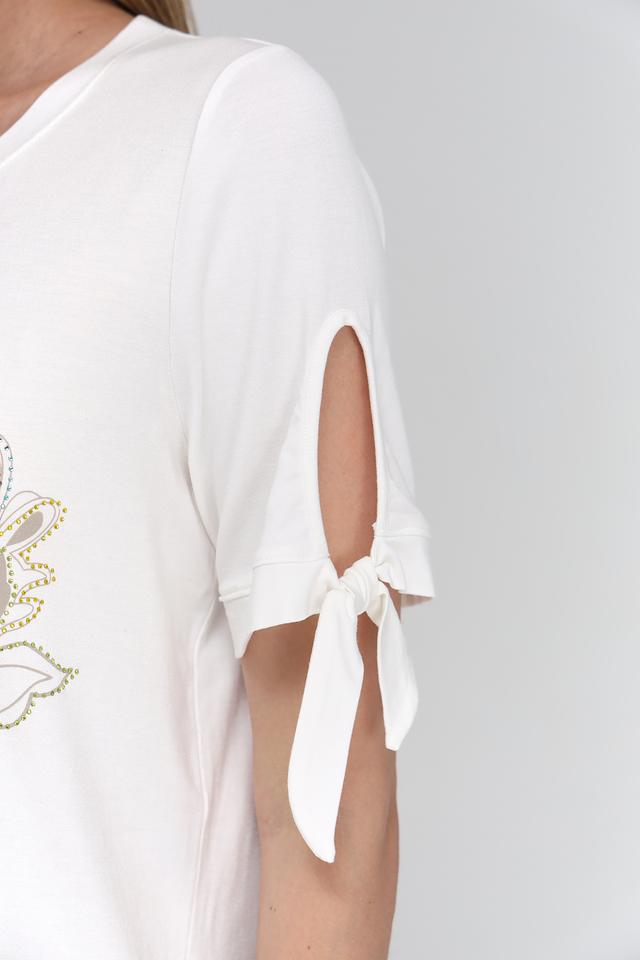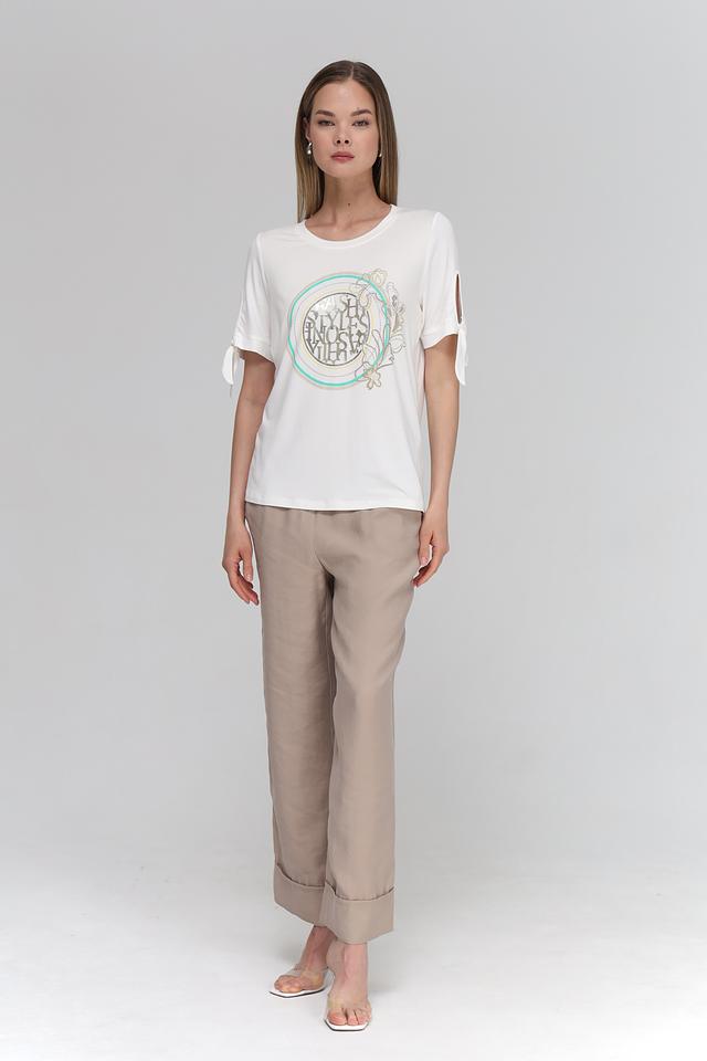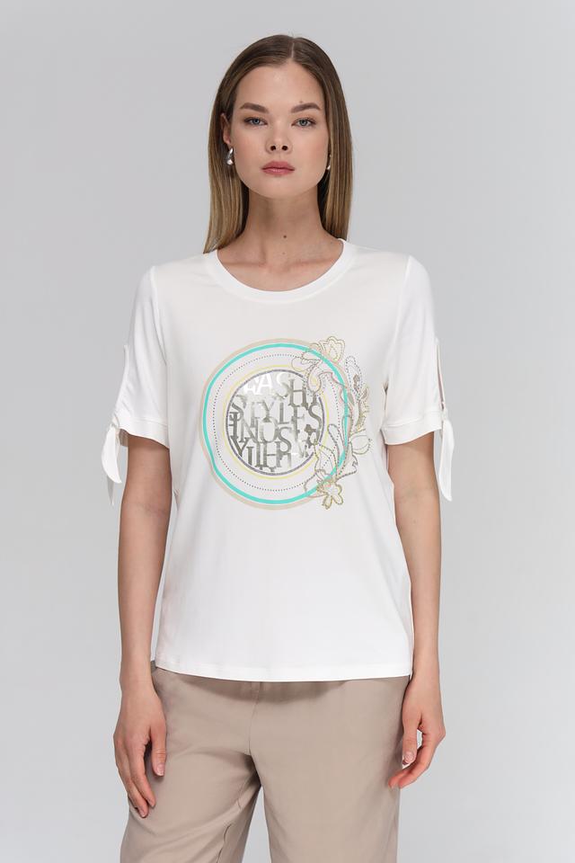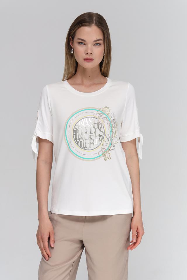 Белая футболка Tuzzi с оригинальным принтом в бирюзово-золотистой гамме. Модель из мягкой вискозы с добавлением эластана, дополнена декоративными завязками на рукавах. Состав: вискоза 95%, эластан 5%
