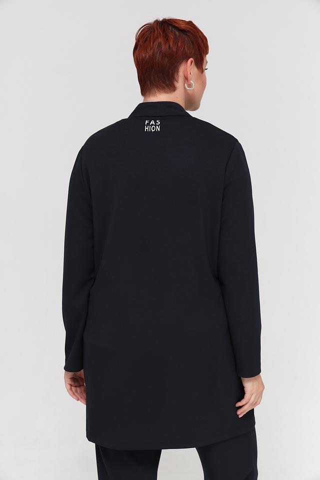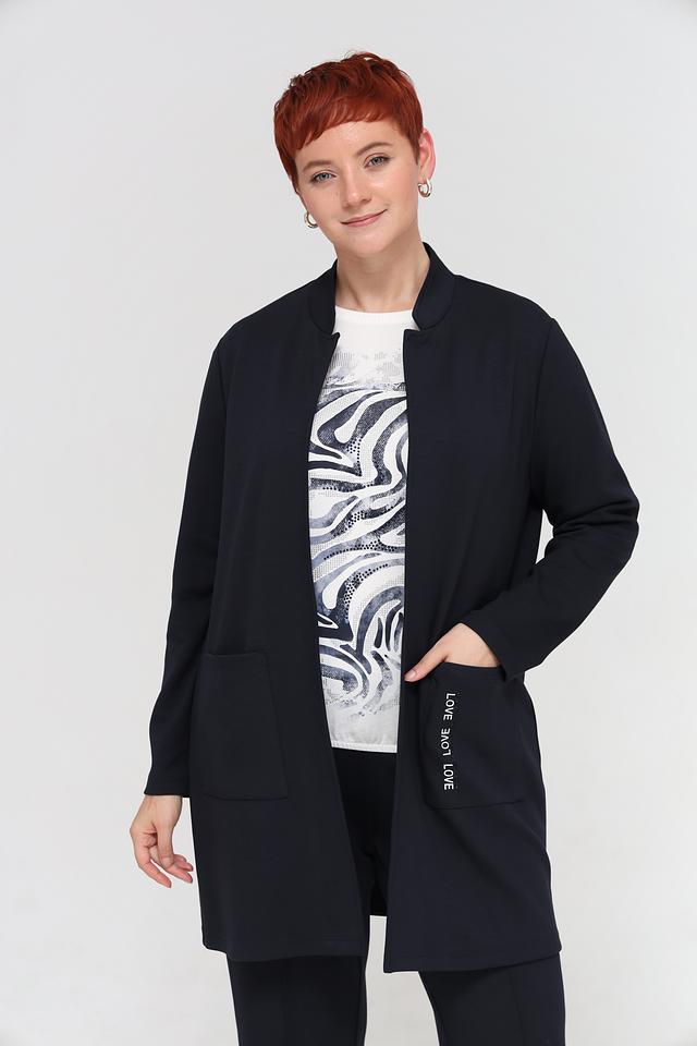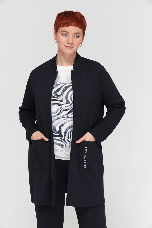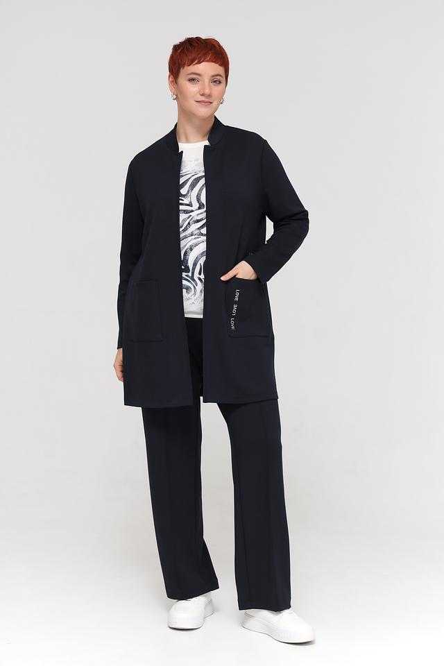 Жакет имеет прямой крой, который подчеркивает фигуру, не сковывая движений. Отсутствие застежки позволяет носить его нараспашку, создавая более расслабленный образ, или дополнять ремнем, чтобы подчеркнуть талию.