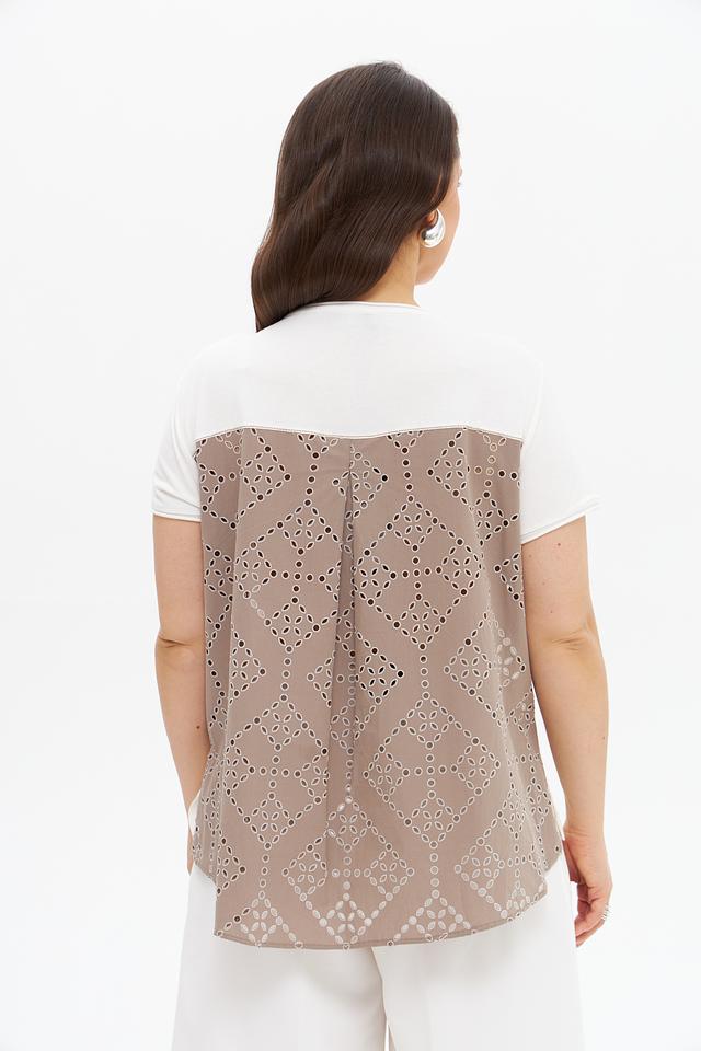 Сзади футболка выполнена из перфорированной ткани бежевого цвета, что добавляет ей легкости и воздушности.