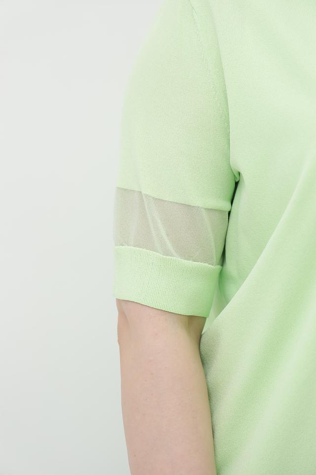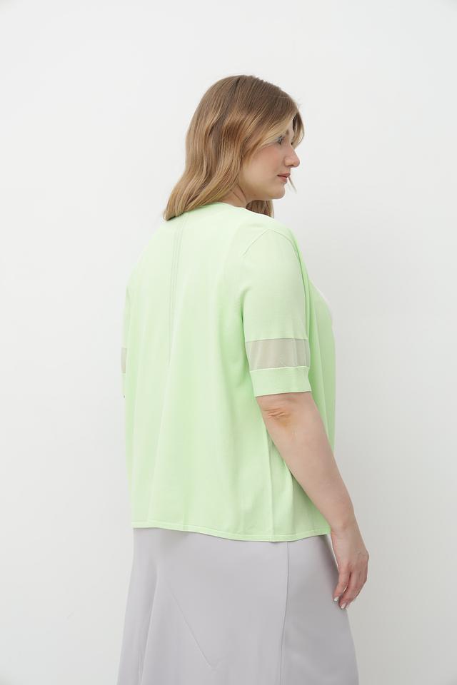 Жакет имеет V-образный вырез, который визуально удлиняет шею и делает силуэт более изящным. Короткие рукава дополнены стильными сетчатыми вставками, которые придают изделию легкость и оригинальность.