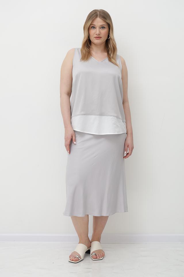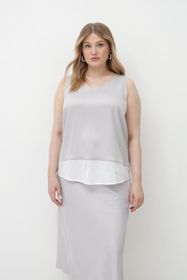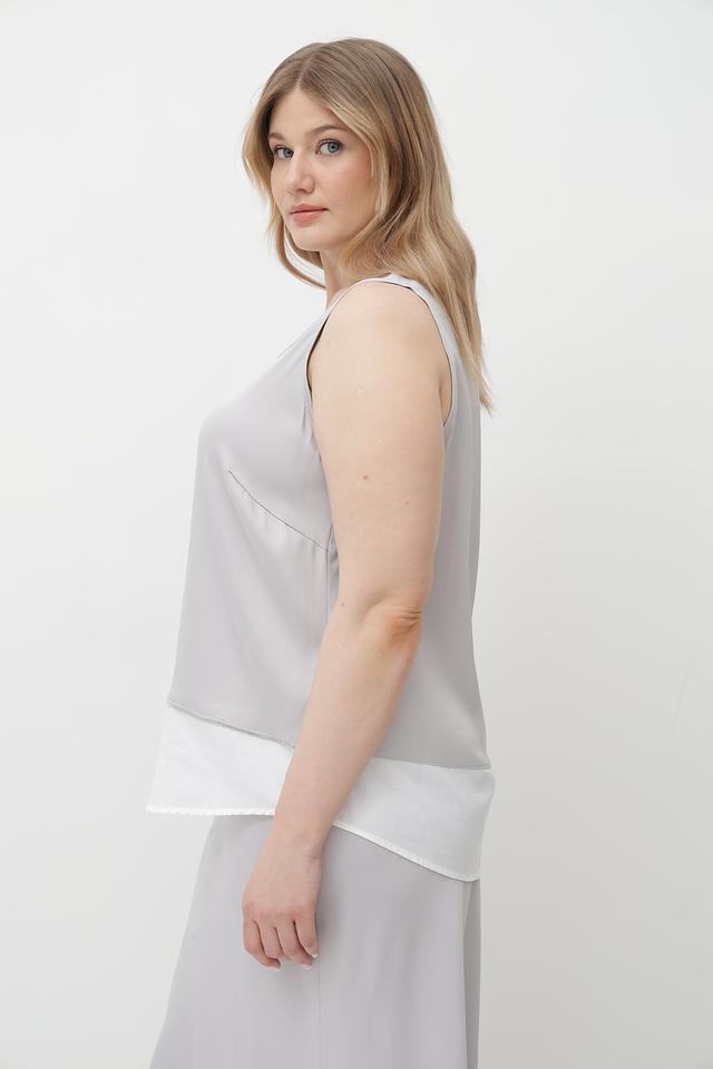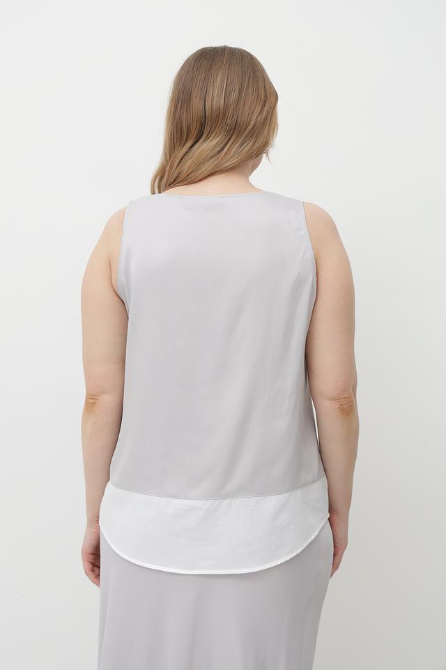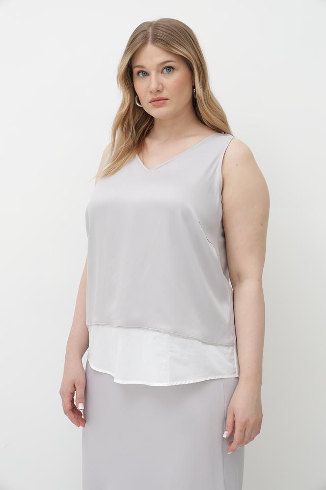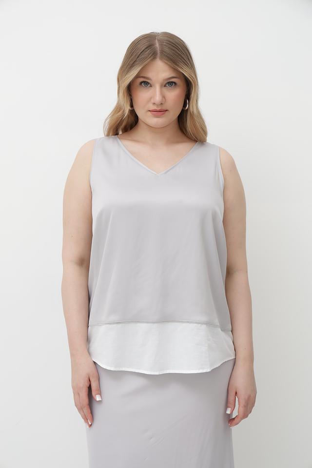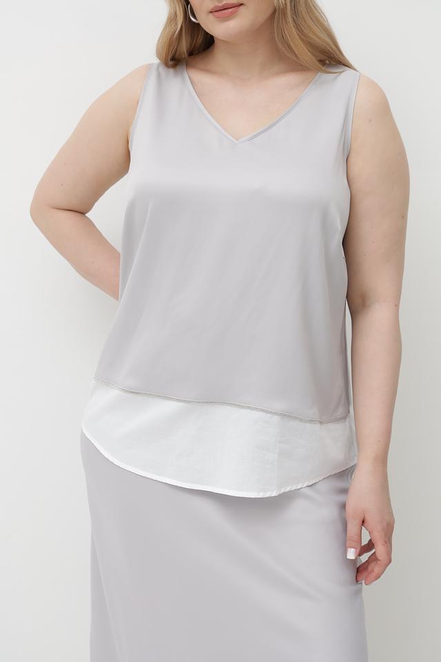 Серый топ Tuzzi из вискозы с V-образным вырезом и контрастным белым воротником. Изготовлен из мягкой и приятной к телу ткани, обеспечивающей комфорт в течение дня. Состав: 95% вискоза, 5% эластан. Состав: вискоза 95%, эластан 5%