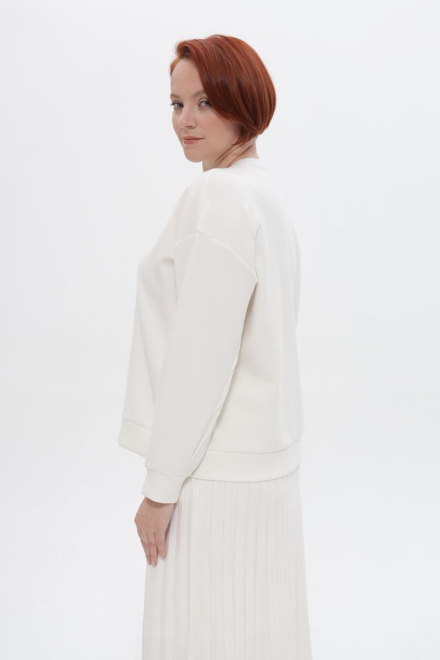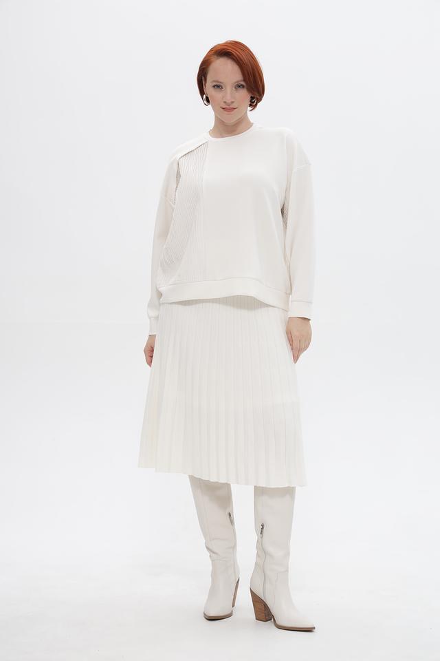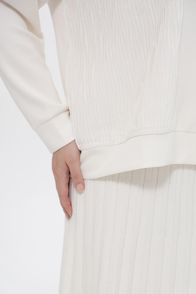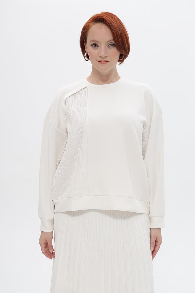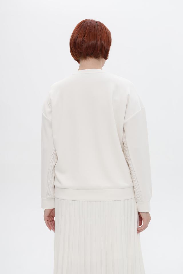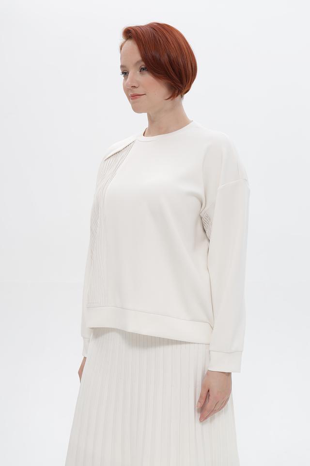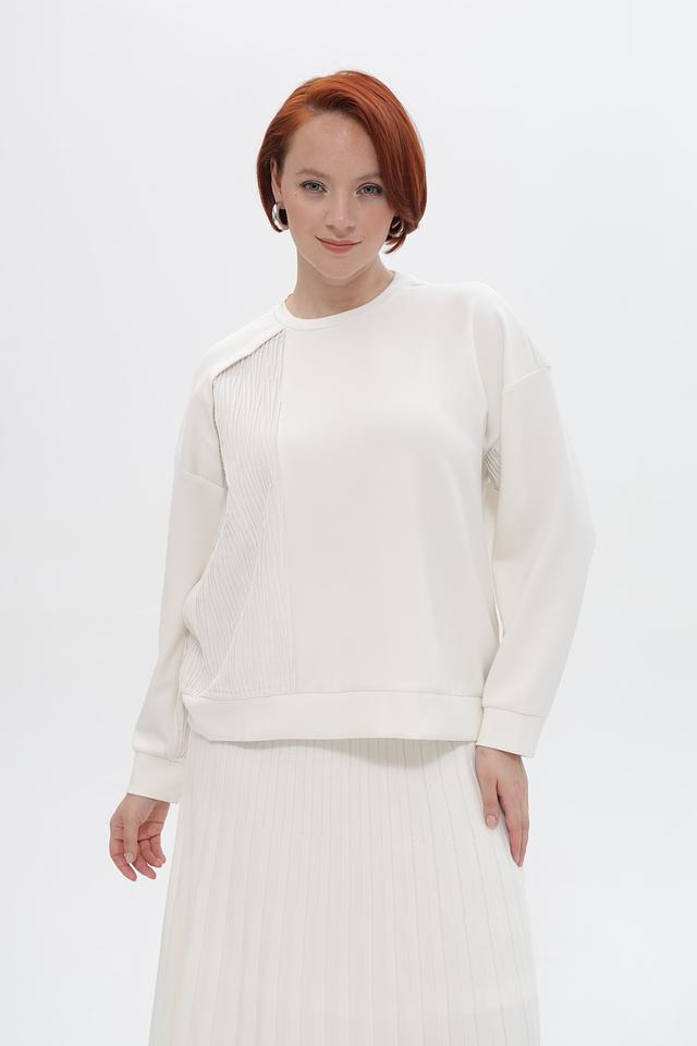 Особенностью пуловера является фактурная вставка с вертикальной текстурой на плече и передней части изделия, которая придает ему оригинальность и современный вид. Эластичные манжеты на рукавах обеспечивают комфортную посадку.