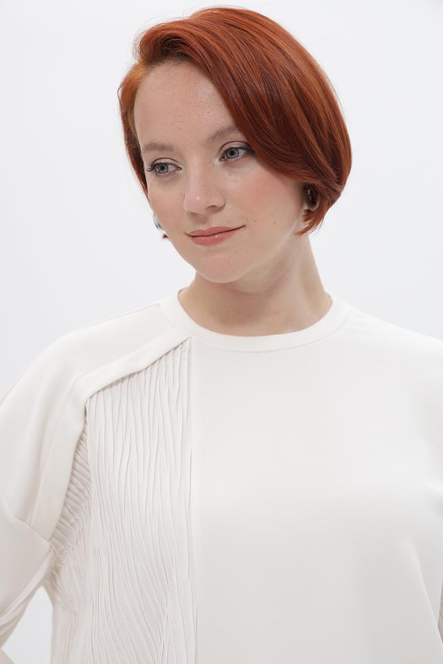 Кремовый пуловер от Tuzzi с оригинальной фактурной вставкой. Изготовлен из мягкой и приятной к телу вискозы с добавлением полиэстера и эластана. Состав: вискоза 60%, полиэстер 35%, эластан 5%