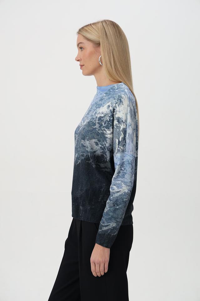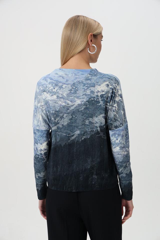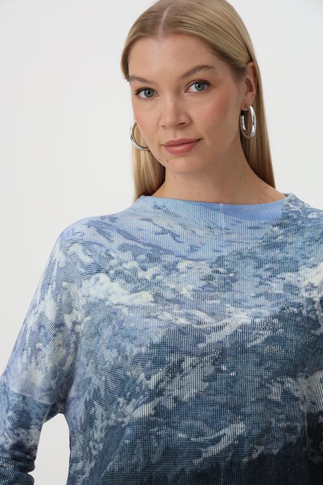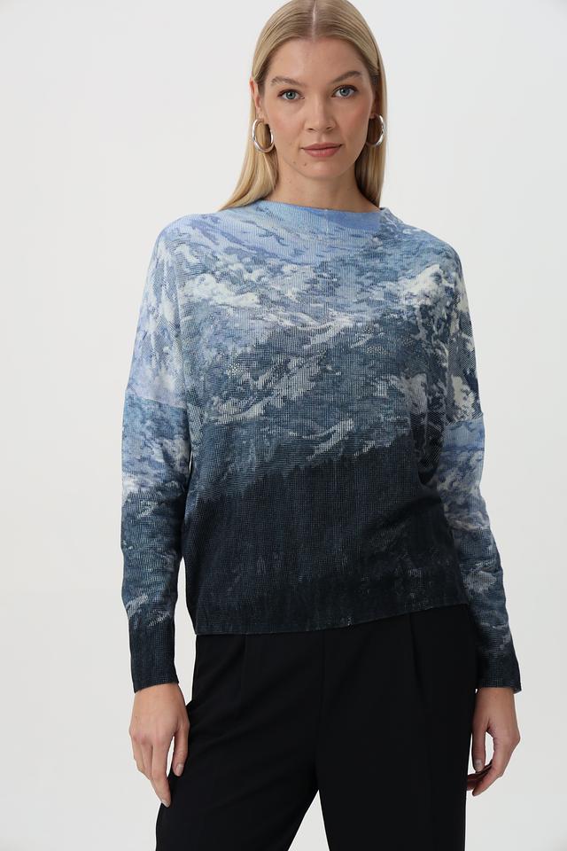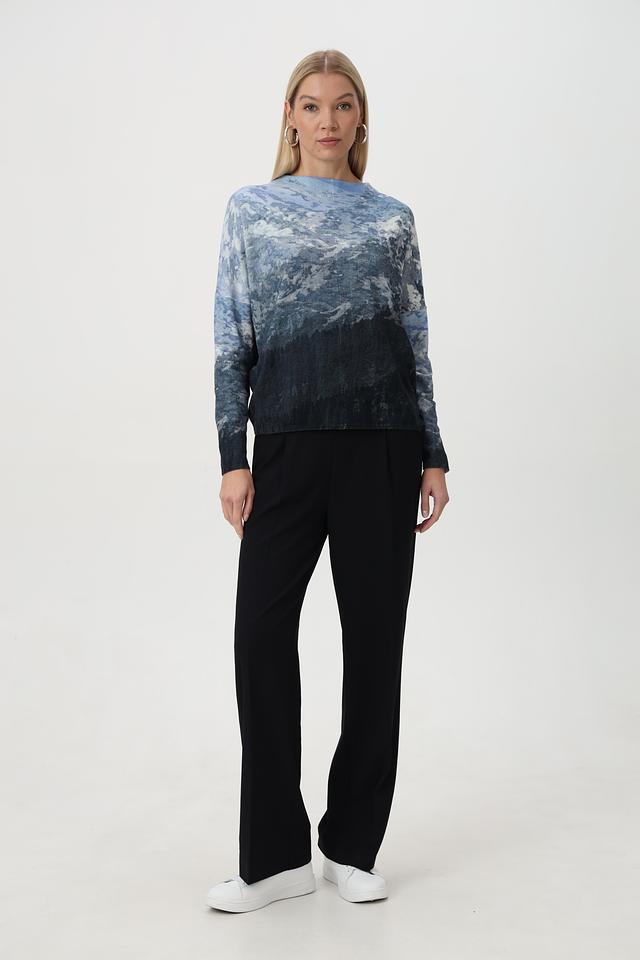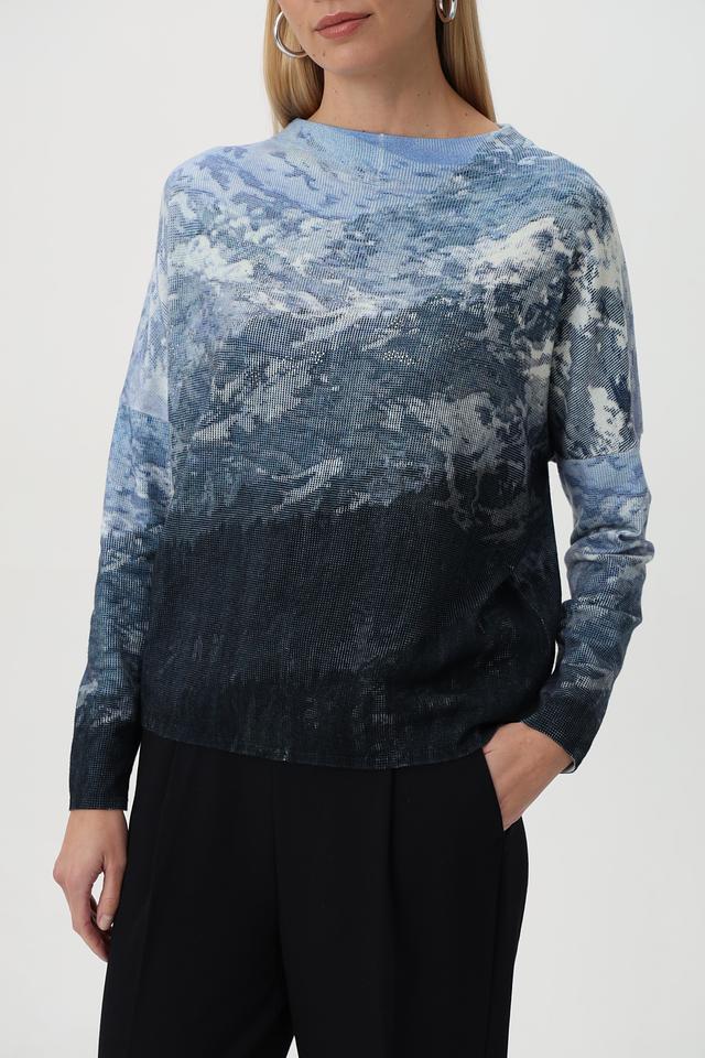 Этот стильный пуловер от бренда Tuzzi станет прекрасным дополнением к вашему гардеробу. Модель выполнена в синих тонах и украшена эффектным принтом, изображающим горный пейзаж.