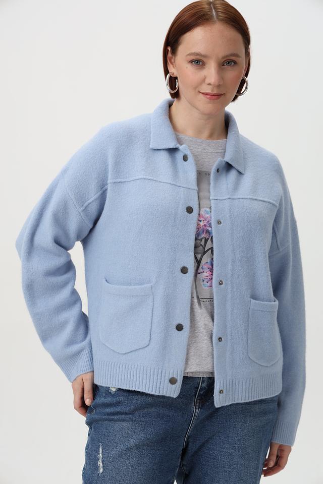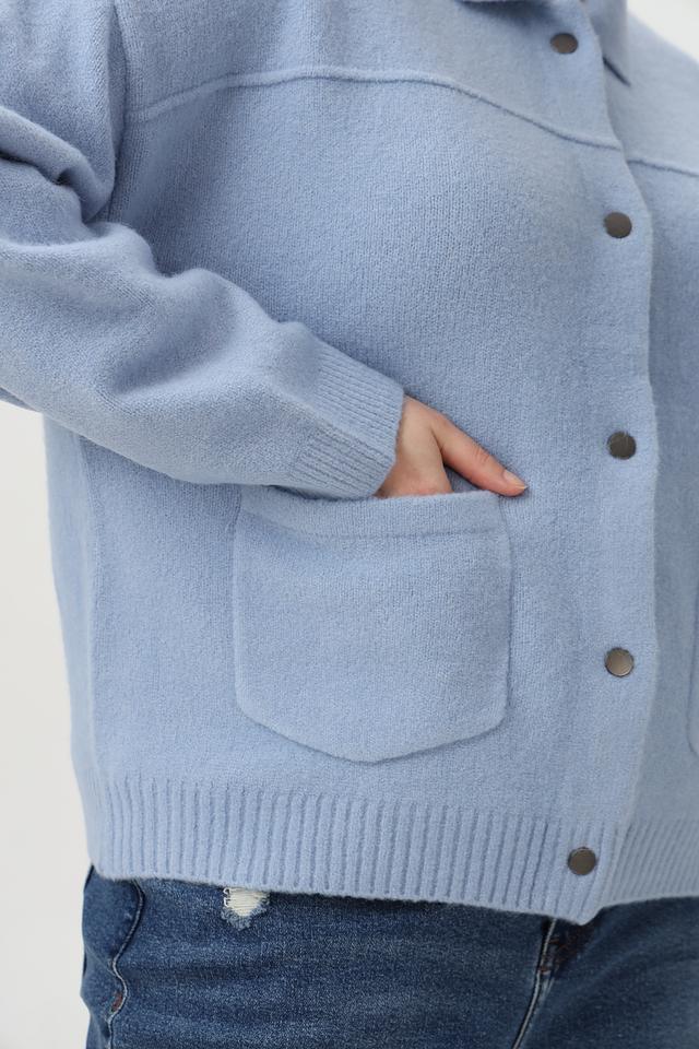 Жакет имеет прямой крой, воротник и застежку на пуговицы по всей длине. На передней части расположены два накладных кармана. Длинные рукава и резинка по низу изделия обеспечивают комфортную посадку.