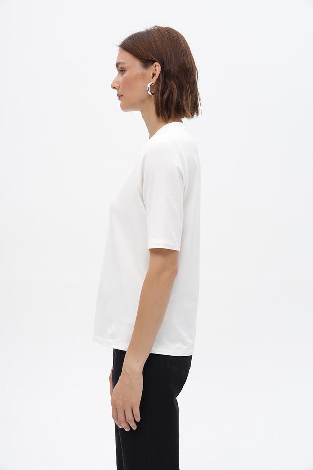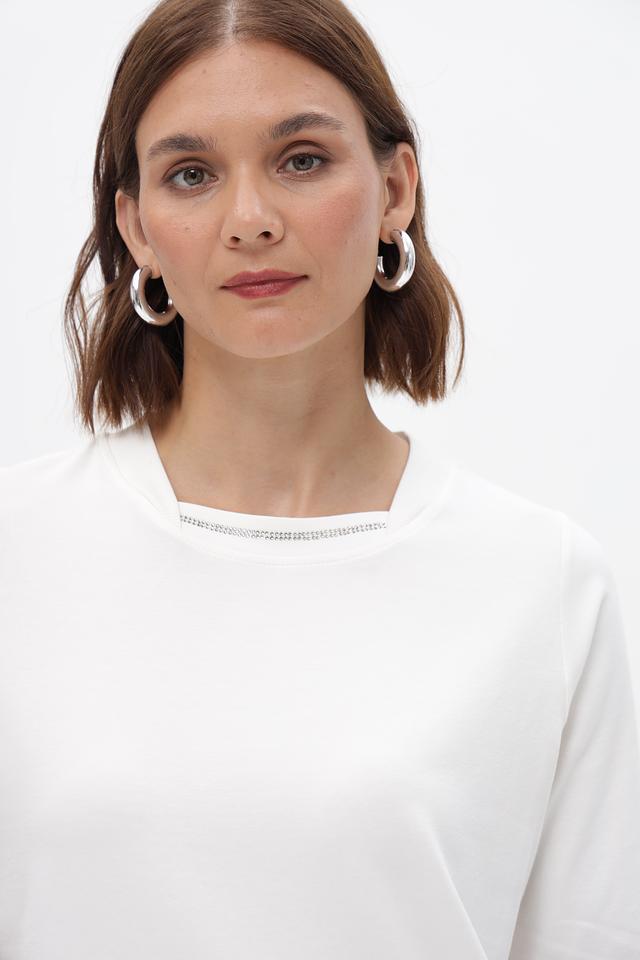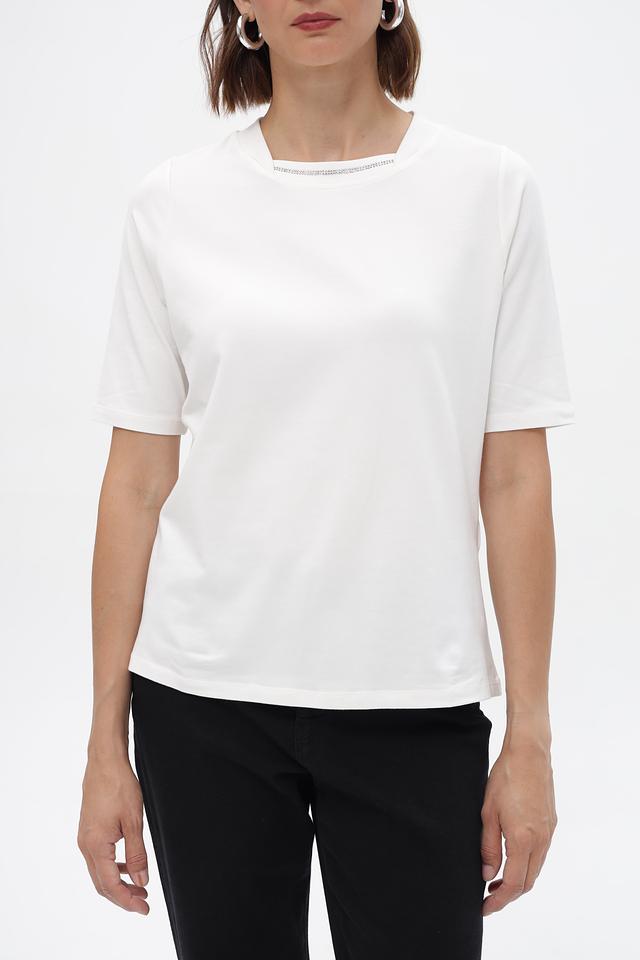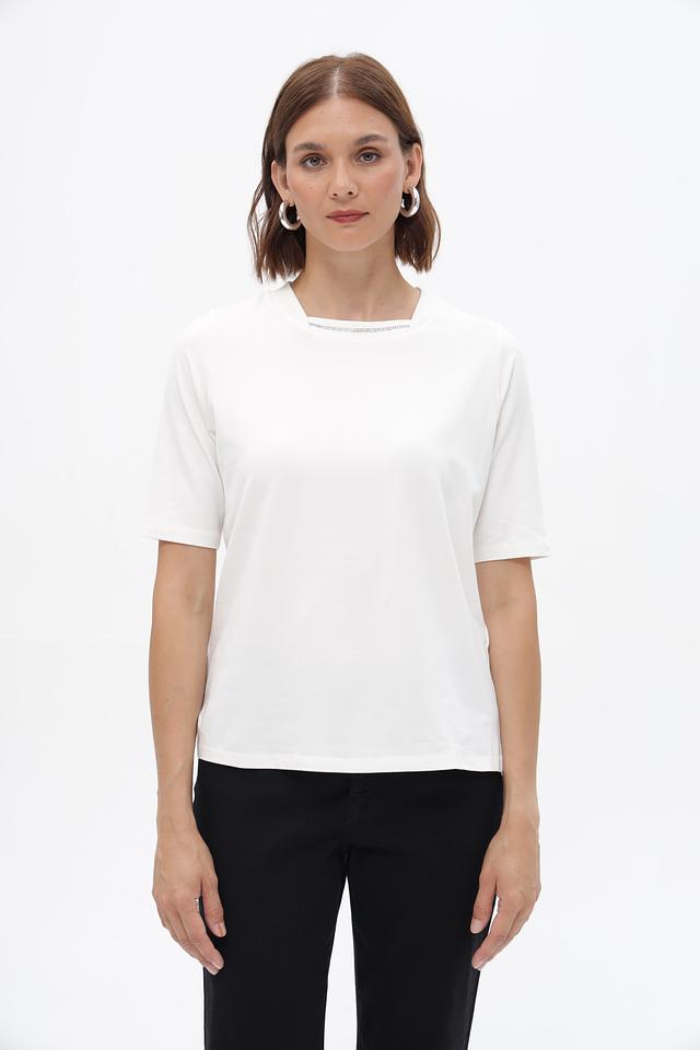Белая футболка Tuzzi с аккуратной отделкой горловины. Изготовлена из мягкого и приятного к телу сочетания хлопка и модала. Состав: хлопок, модал, эластан. Состав: хлопок 46%, модал 46%, эластан 8%