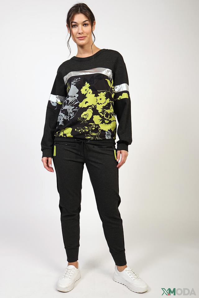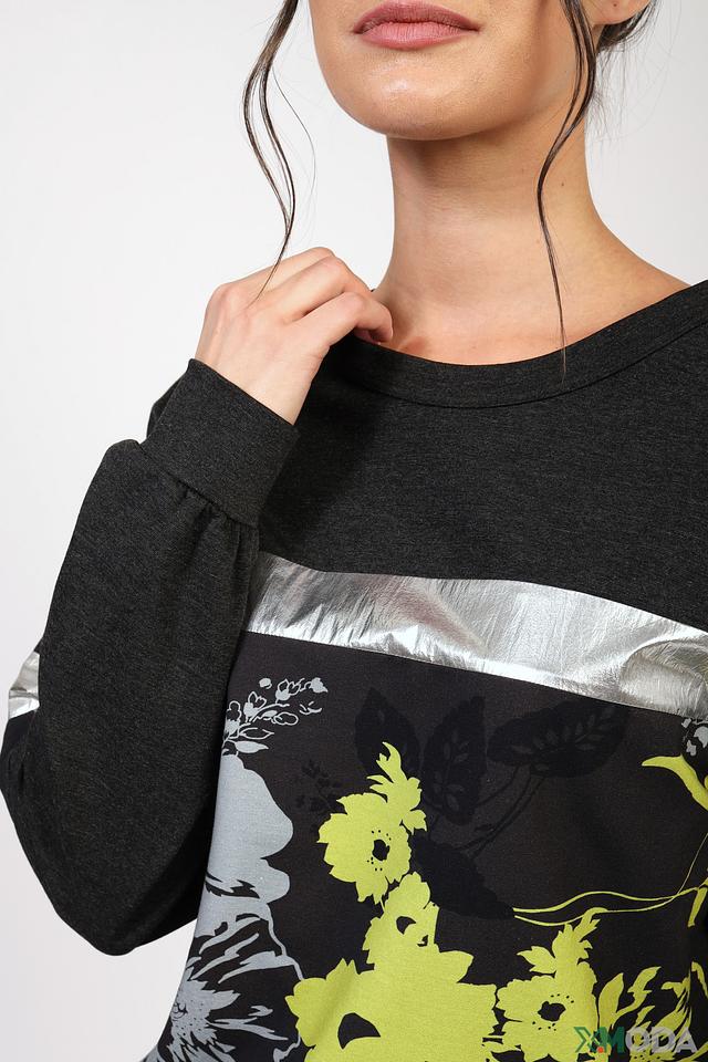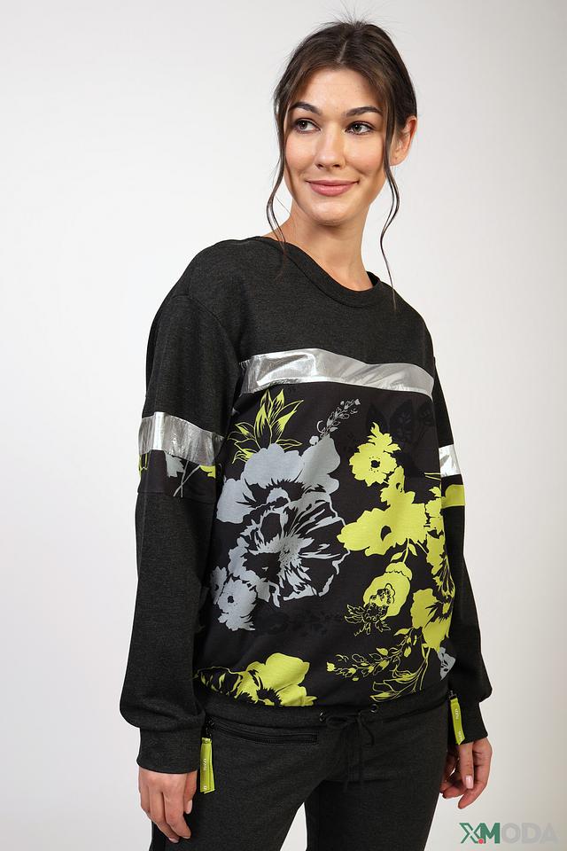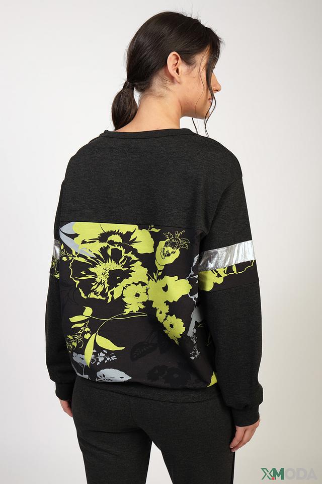 Пуловер имеет свободный крой и круглый вырез горловины. Основной цвет – чёрный, который служит идеальным фоном для яркого цветочного принта, выполненного в оттенках жёлтого, зелёного и серого. Дополнительным акцентом являются две серебристые полосы на плечах, придающие образу современный вид.