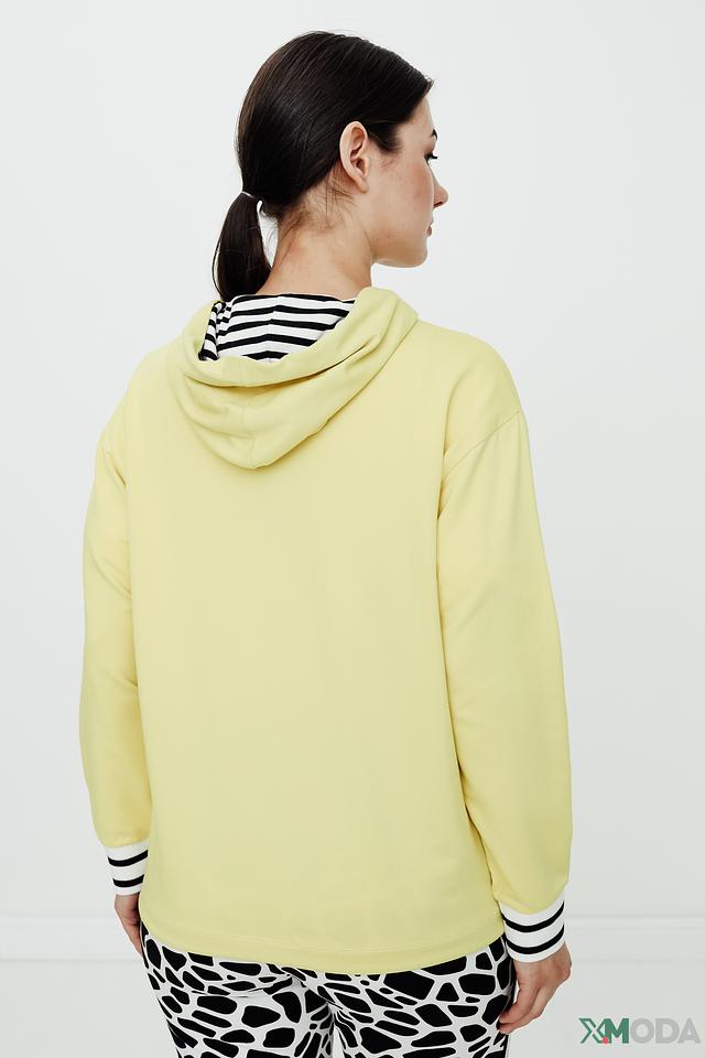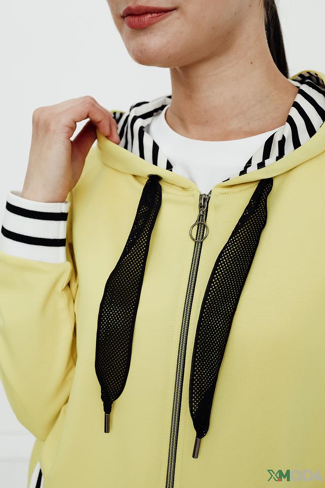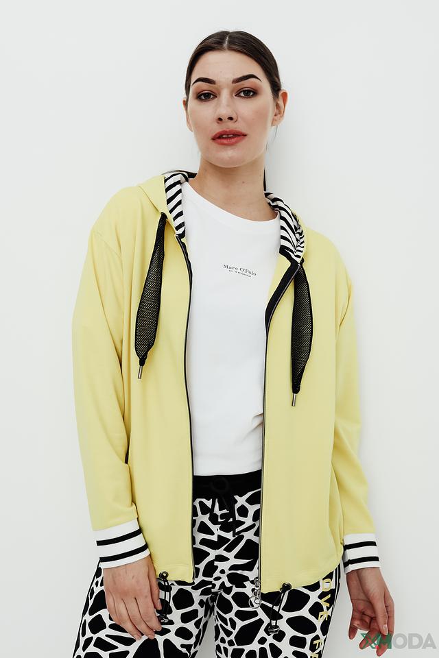 Жёлтый жакет от Tuzzi с капюшоном и застежкой-молнией станет отличным дополнением к вашему гардеробу. Модель выполнена из мягкой ткани с добавлением хлопка и модала, что обеспечивает комфорт в носке. Декоративные полосы на рукавах и капюшоне придают образу спортивный шик. Состав: хлопок 45%, модал 45%, эластан 10%
