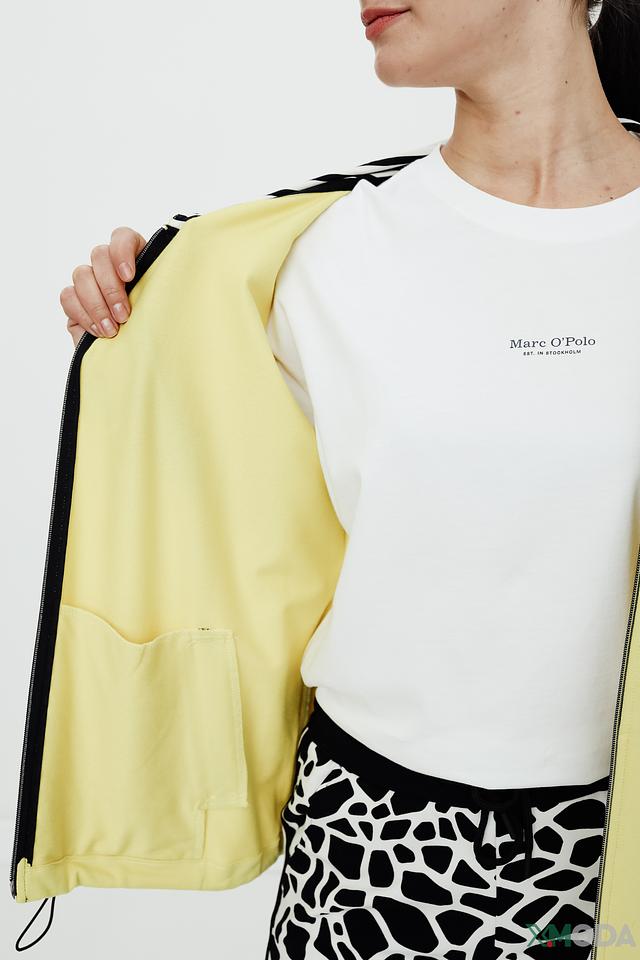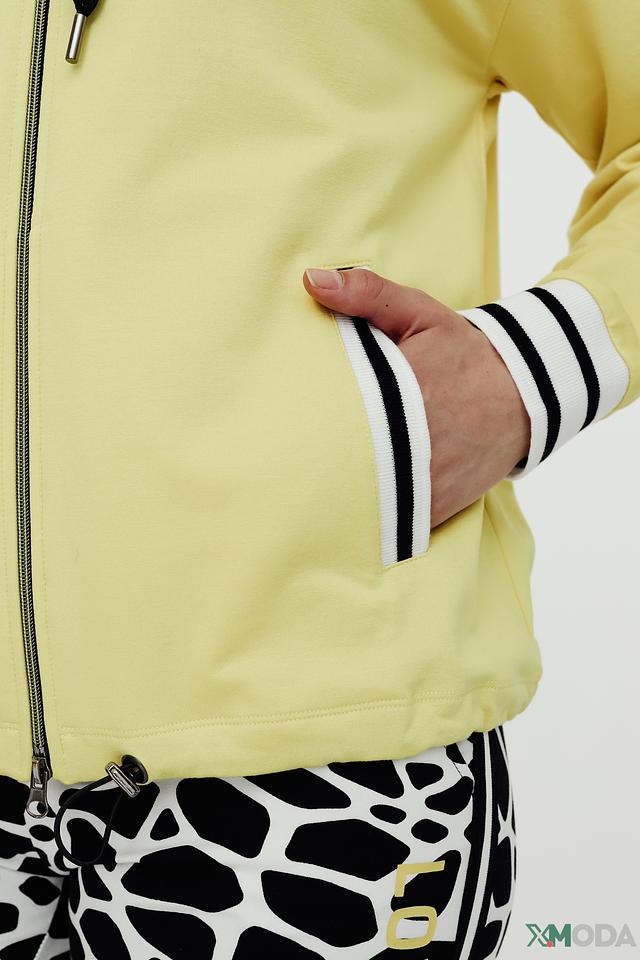 Модель имеет свободный крой, который не сковывает движений и обеспечивает комфорт в течение всего дня. Декоративные полосы на рукавах и по низу изделия придают образу динамичный и современный вид. Жакет выполнен из высококачественного материала, сочетающего в себе хлопок, модал и эластан, что обеспечивает мягкость, приятные тактильные ощущения и хорошую посадку по фигуре.