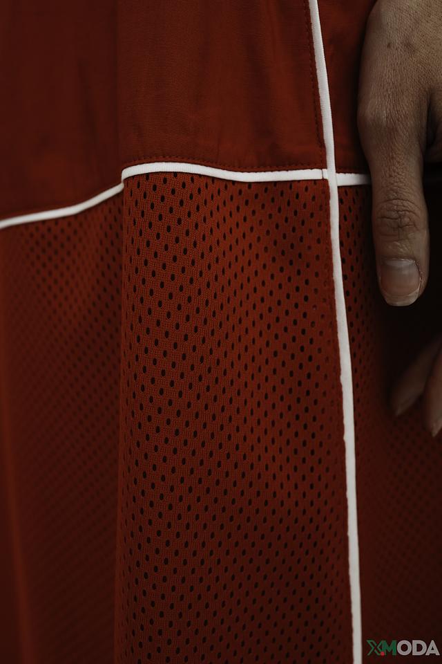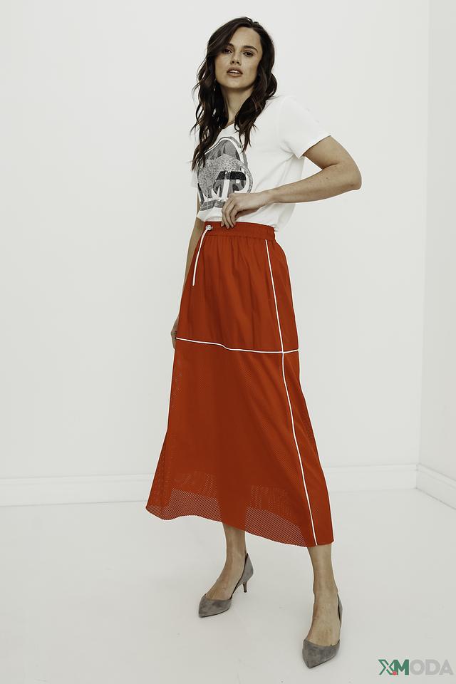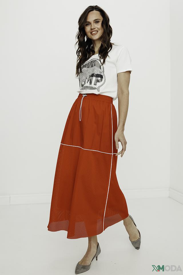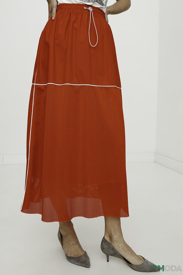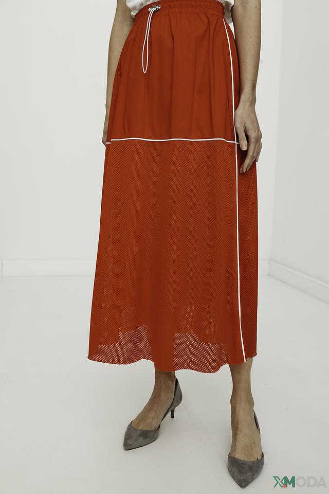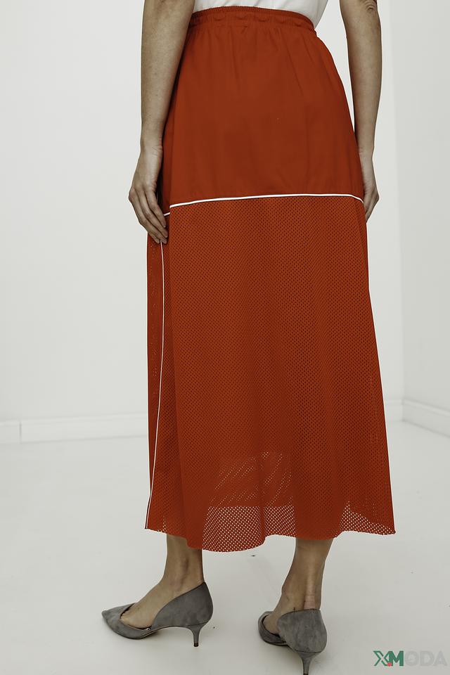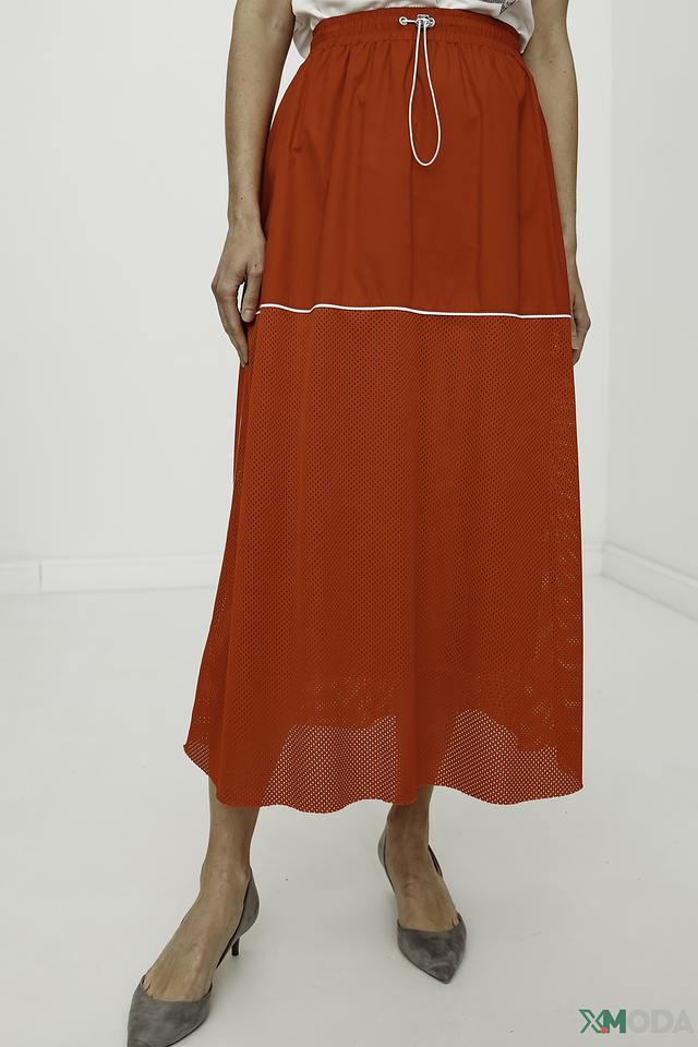 Юбка имеет длину миди и свободный крой, обеспечивающий свободу движений. Верхняя часть юбки выполнена из гладкой ткани насыщенного красного цвета, а нижняя – из полупрозрачной сетки, что придает ей легкость и воздушность.