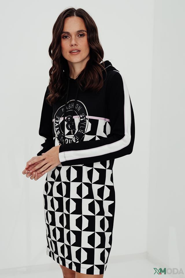 Платье имеет удобный капюшон и выполнен из приятной к телу ткани, состоящей из 97% хлопка и 3% эластана. Белые полосы на рукавах добавляют динамики образу. Крой платья свободный, что обеспечивает комфорт при носке.