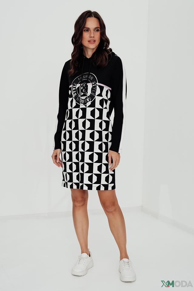 Это платье от бренда Tuzzi станет отличным дополнением к вашему гардеробу. Основной цвет платья – чёрный, а нижняя часть украшена контрастным геометрическим принтом в белых тонах.