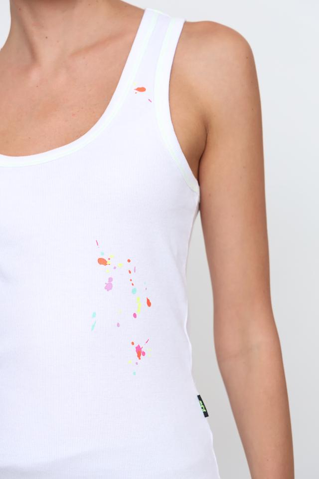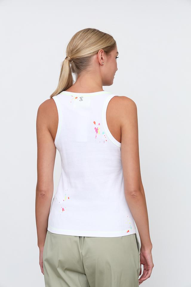 Белый топ Twin Set Actitude — это стильная базовая вещь с оригинальным дизайном в виде разноцветных брызг. Модель выполнена из мягкого хлопка с добавлением эластана, обеспечивающего комфортную посадку. Состав: хлопок 95%, эластан 5%