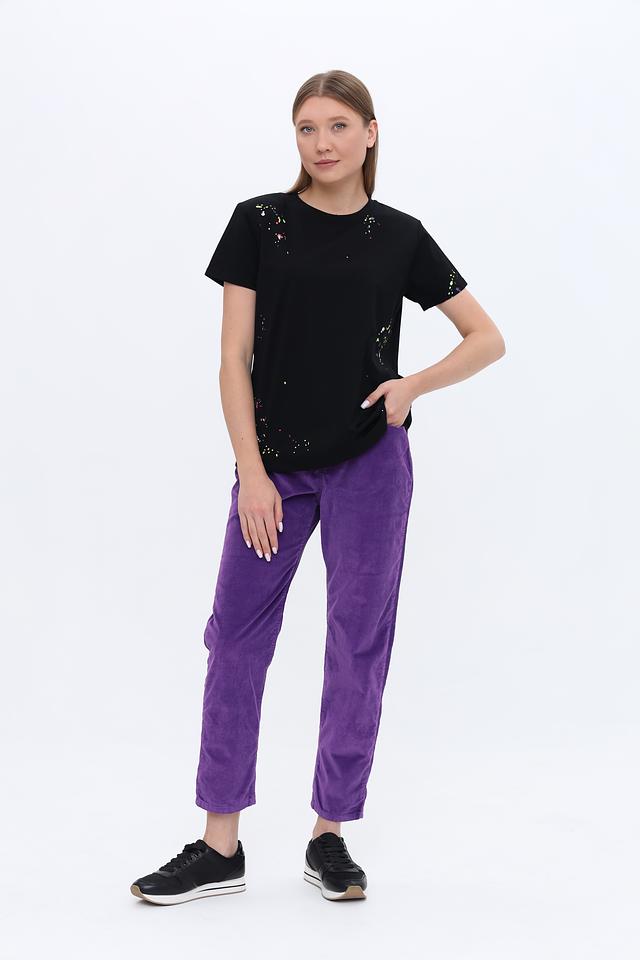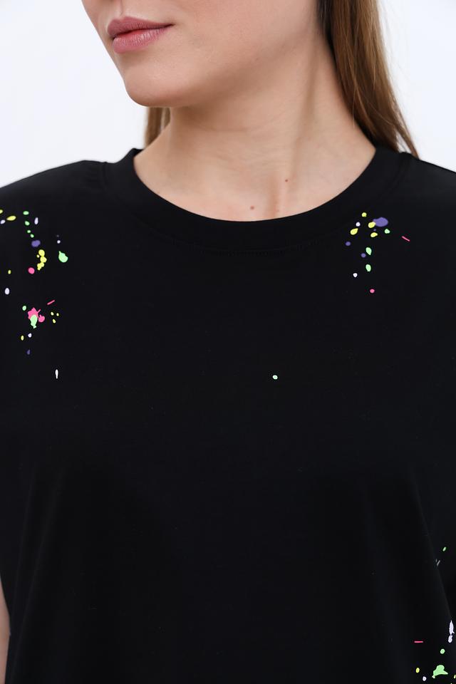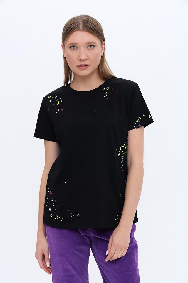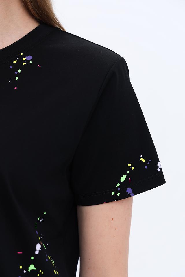 Особенностью данной модели является яркий и необычный принт в виде разноцветных брызг, который добавляет образу оригинальности и динамики. Чёрный цвет футболки делает её универсальной и легко сочетаемой с различными элементами гардероба.