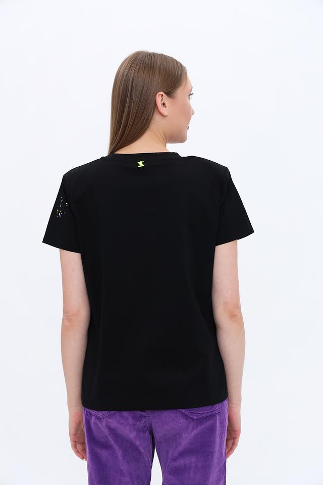 Чёрная футболка Twin Set Actitude с оригинальным принтом в виде разноцветных брызг. Изготовлена из мягкого хлопка, обеспечивающего комфорт в носке. Стильный и современный выбор для повседневного образа. Состав: хлопок 100%, Состав_2 хлопок 95%, Состав_2 эластан 5%