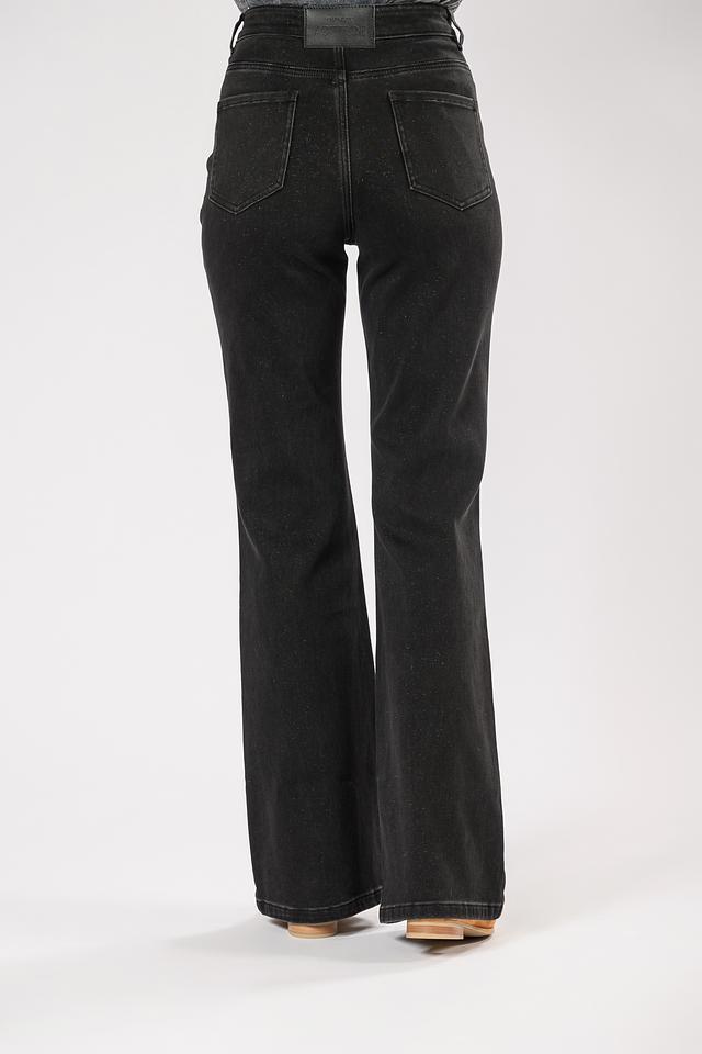 Джинсы имеют высокую посадку, которая визуально удлиняет ноги и подчеркивает талию. Клеш от колена придает образу ретро-шарм и делает силуэт более сбалансированным. Ткань джинсов состоит из хлопка, полиэстера и небольшого количества эластана, что обеспечивает комфорт при носке и хорошую посадку по фигуре.